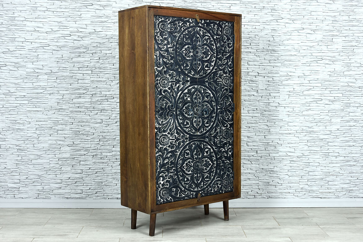 Ten mebel został wykonany ręcznie w Indiach w małej manufakturze. Do jego produkcji użyto drewna mango. Korpus i nóżki w odcieniu średniego brązu, drzwi czarne z białymi prześwitami. Oprócz walorów estetycznych szafa jest również bardzo praktyczna. Posiada 3 pojemne półki. Mebel odnajdzie się w każdym pomieszczeniu.