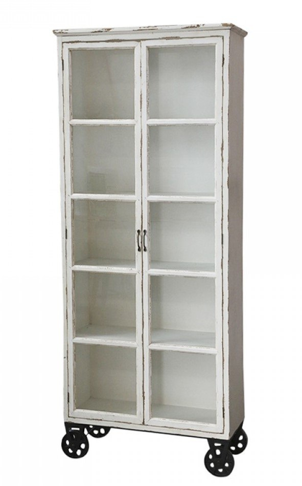 Biała, drewniana witryna na kółkach w stylu prowansalskim marki Chic Antique.