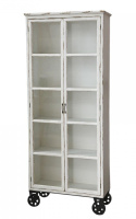 Mebel wykonano z połączenia drewna i sklejki, front przeszklono, a pod spodem zamontowano metalowe kółka w stylu loft. Kredens przecierany i postarzany o bardzo uniwersalnym zastosowaniu. Ten wyjątkowy regał odnajdzie się szczególnie w prowansalskiej kuchni lub jadalni w stylu country ale może być również pomocnikiem i organizerem w romantycznym biurze, salonie kosmetycznym czy restauracji.
