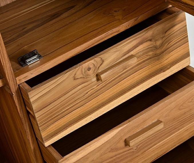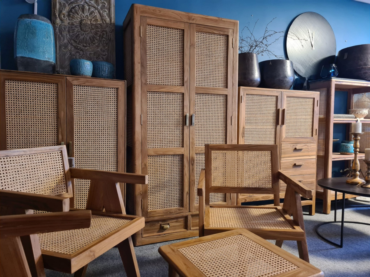 Szafka wykonana jest z drewna tekowego uzyskanego z recyklingu. Fronty wykonano z naturalnego rattanu, w formie tzw. plecionki wiedeńskiej. Jej wyjątkowość polega na specyficznym, jedynym w swoim rodzaju splocie. Ośmiokątny wzór nadaje trwałości, przy jednoczesnym zachowaniu lekkości, elastyczności i przewiewności.