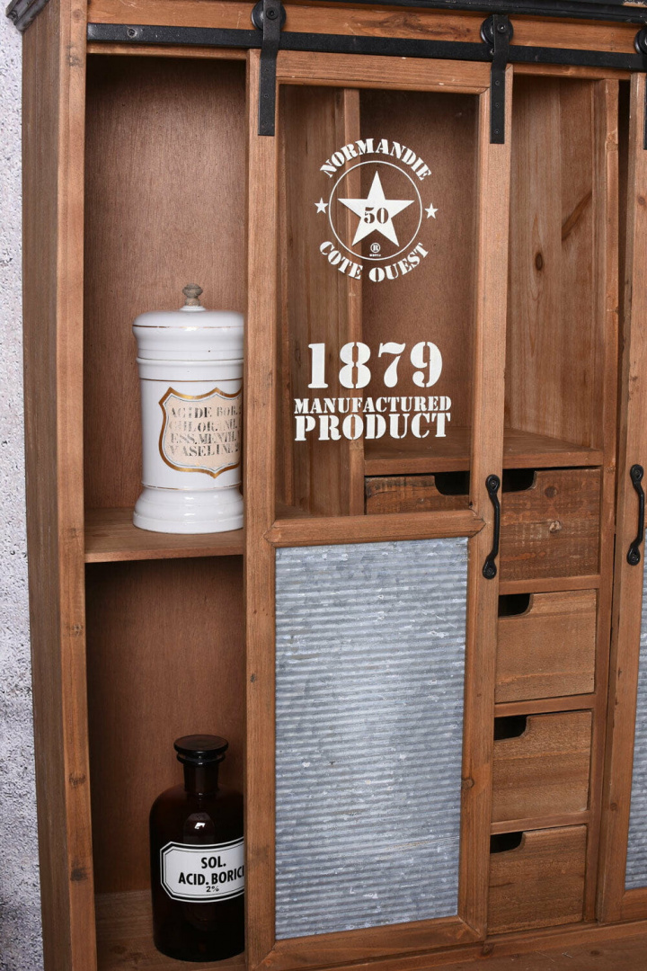Witryna jest niezwykle pojemna i praktyczna. Posiada pojemne półki i schowki, a także osiem szuflad różnej wielkości. Polecamy łączyć z produktami takimi jak: stół z drewna i metalu, loftowe krzesła czy lampa w stylu farmhouse.