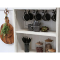 Regał posiada organizer na talarze, haczyki na kubki, cztery szufladki z metalowymi ozdobnymi uchwytami oraz otwarte półki. Pomieści więc wiele niezbędnych naczyń, a jednocześnie zaczaruje Twoją przestrzeń.