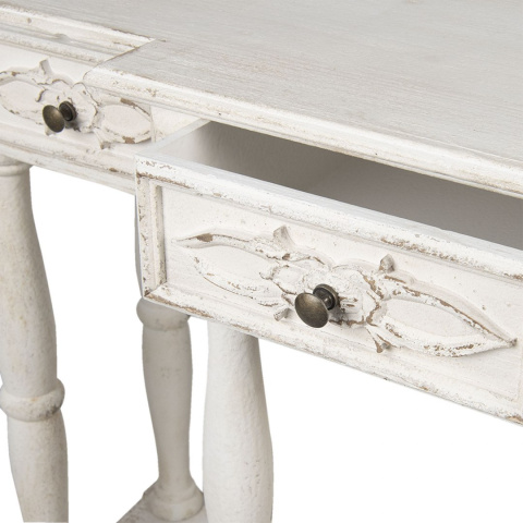 Mebel o bardzo eleganckim, dekoracyjnym kształcie. Bielony blat i masywną podstawę połączono ze stylowymi, toczonymi tralkami i przetarciami. Florystyczne zdobienia na szufladach dopełniają wysmakowaną całość i dodają meblowi charakteru vintage.