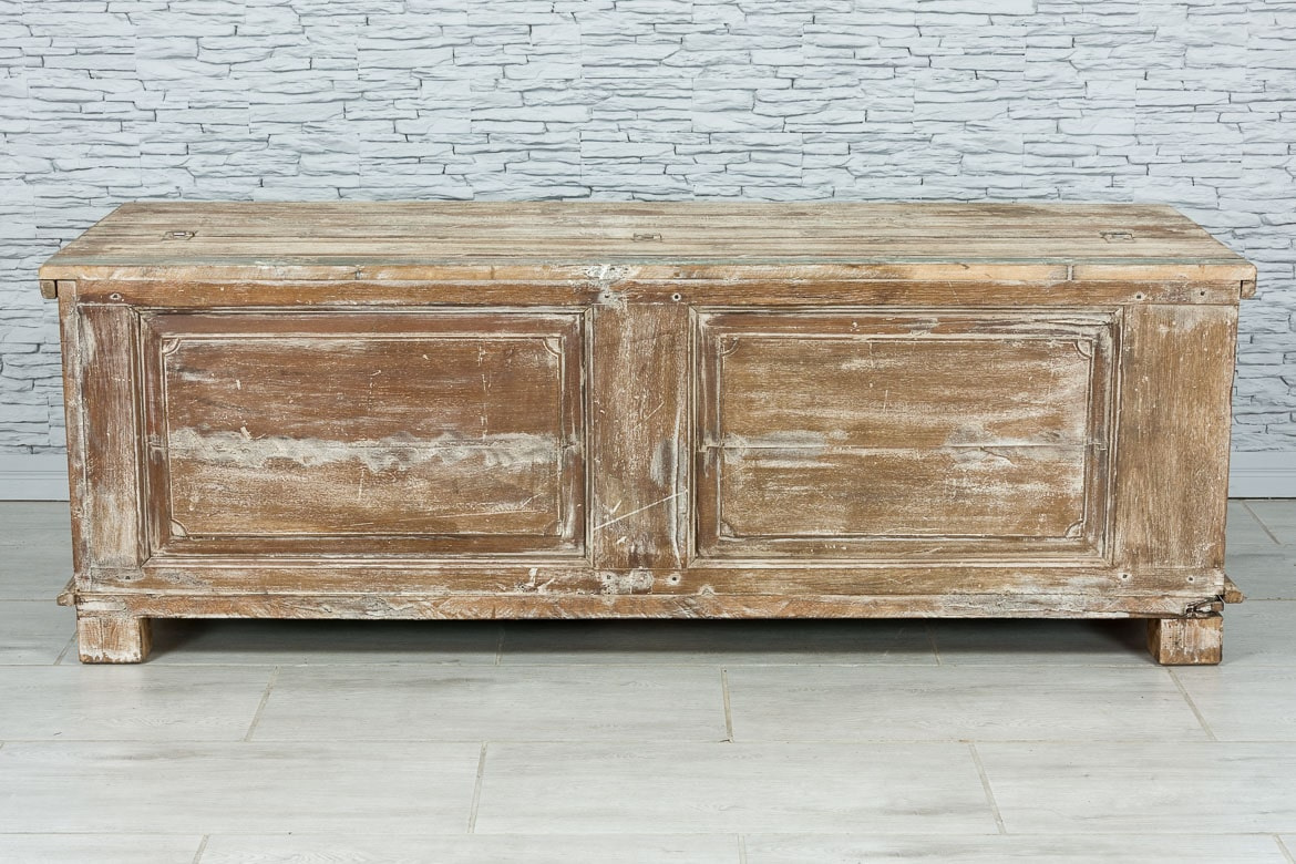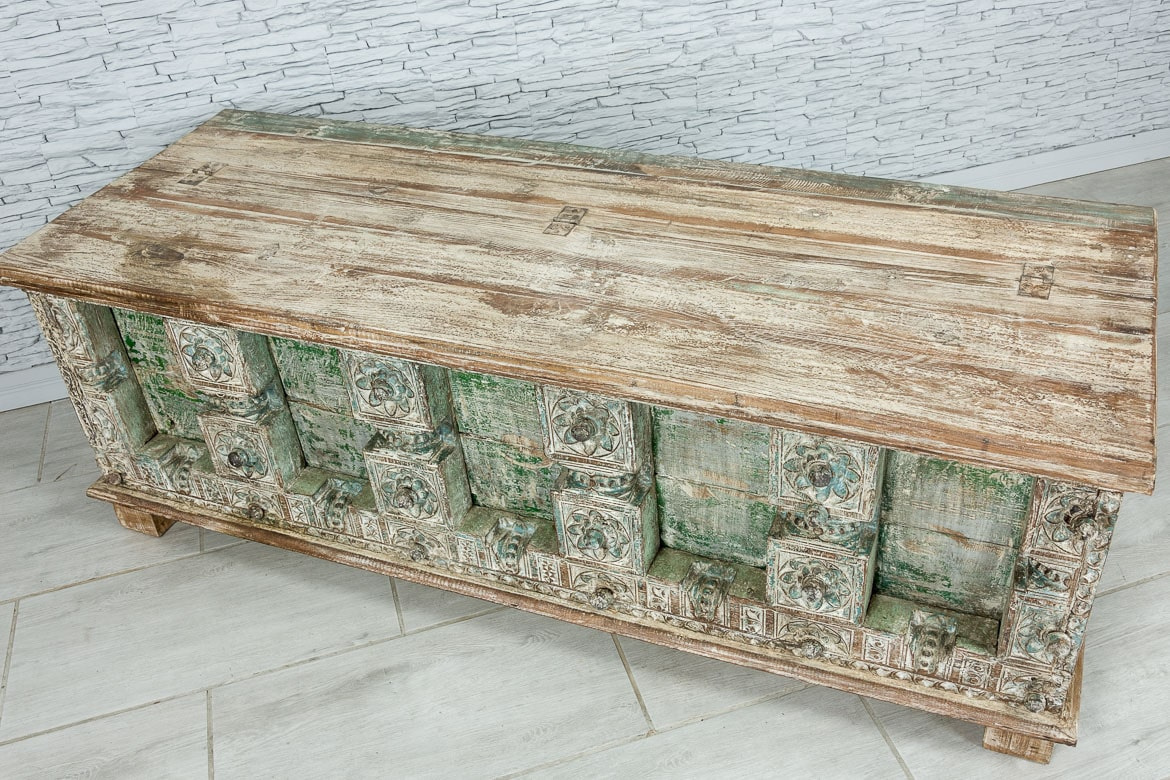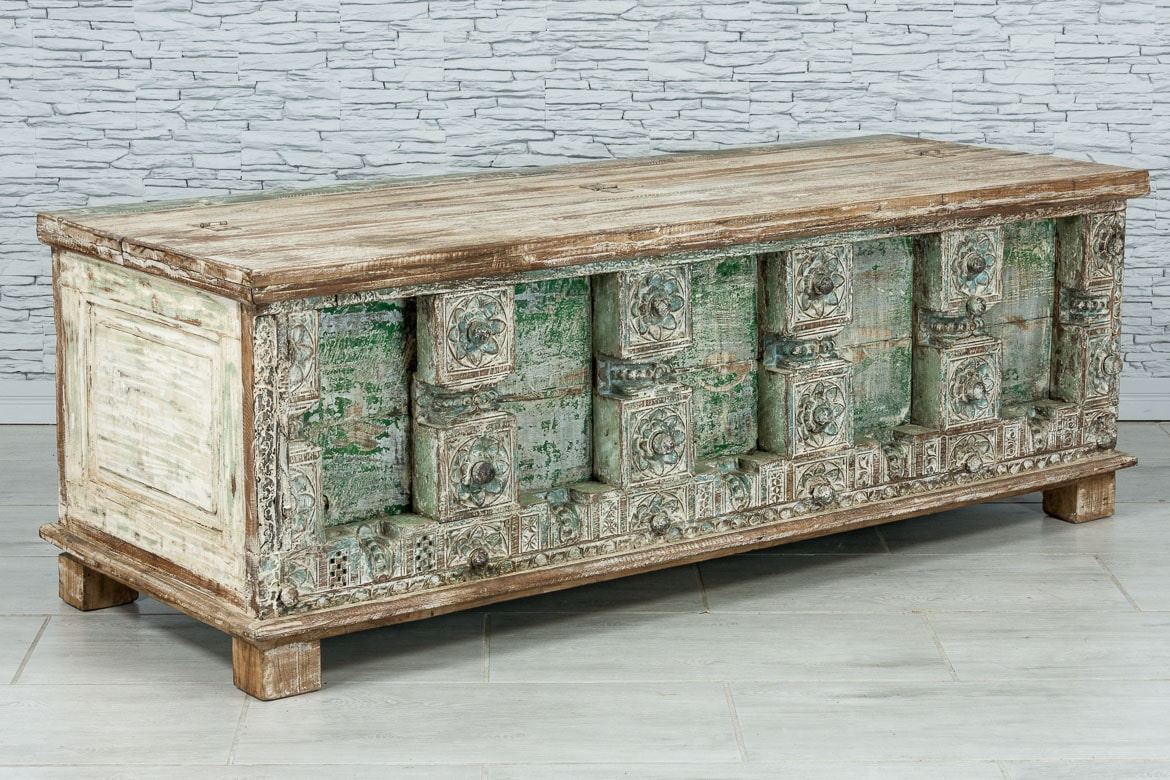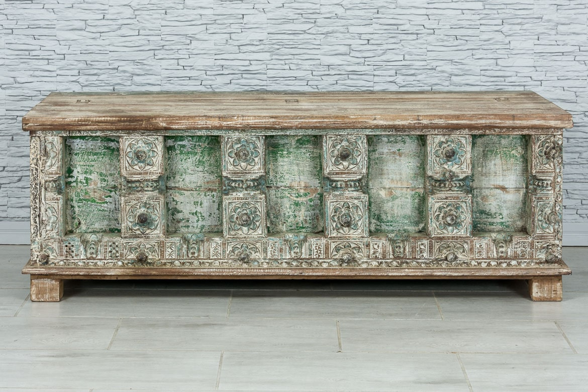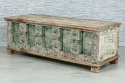 Tę wyjątkową skrzynię wykonano ze starych, odzyskanych elementów. Sprawdzi się jako pojemny schowek i będzie jednocześnie oryginalną ozdobą wnętrza. Ta piękna, orientalna skrzynia, posiada masywną, solidną konstrukcję. Jest więc trwała i odporna na zniszczenia. Piękne, charakterystyczne dla Radżastanu rzeźbienia, wspaniale współgrają z pastelowymi kolorami i przetarciami. Skrzynia wykonana ręcznie w indyjskiej manufakturze.