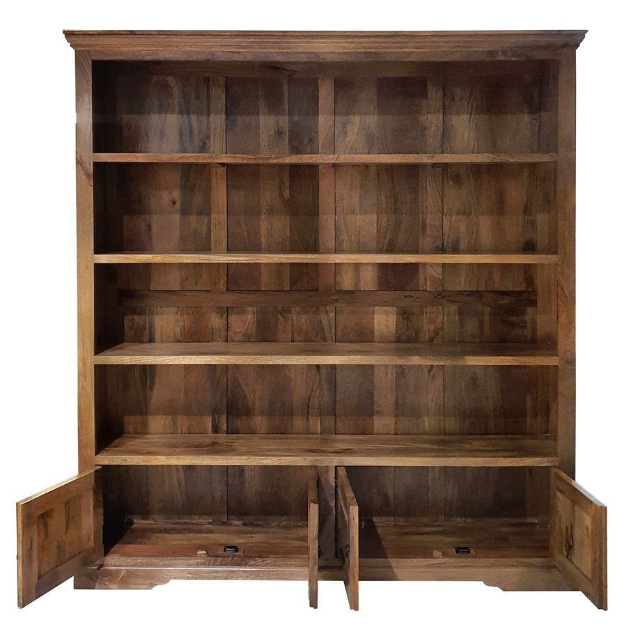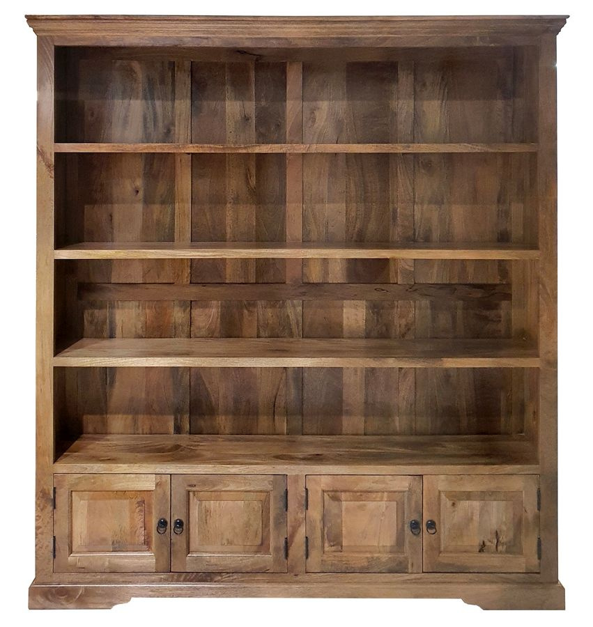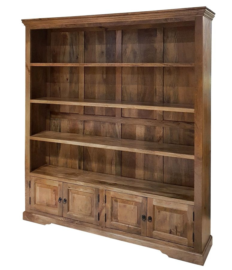 Regał wykonany z grubej, litej deski mango w ciepłym odcieniu toffi. Mebel wykończony lakierem satynowym, co sprawia, że przy dotyku można poczuć naturalną strukturę drewna. Ta wyjątkowa biblioteka posiada cztery obszerne półki i dwie szafki w dolnej części, Całość opiera się na szerokiej stopie, a dodatkową ozdobą mebla jest pilaster na jego szczycie.