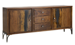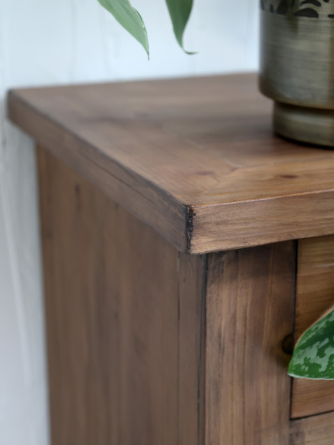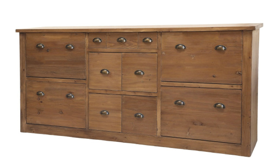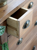 Komoda z szufladami różnej wielkości, co sprawia, że jest niezwykle ciekawa stylistycznie jak również praktyczna i funkcjonalna. Komodę wykonano w całości z litego drewna i wykończono rustykalnymi uchwytami w kolorze starego złota. Mebel bardzo stabilny i trwały. Posiada cztery duże szuflady, cztery mniejsze i trzy mini szufladki w górnej części.