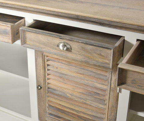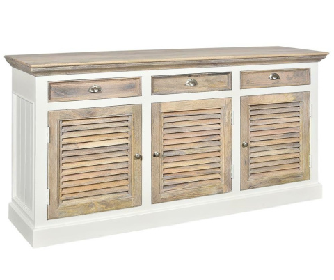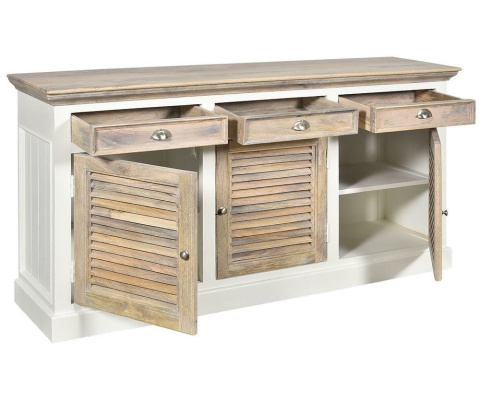 Mebel dedykowany jasnym, przestronnym wnętrzom. Odnajdzie się zarówno w salonie jak i słonecznej jadalni. Posiada trzy szuflady i trzy pojemne schowki ukryte za pięknymi, ażurowymi frontami typu shutters. Komoda pomieści wiele przedmiotów i pozwoli Ci utrzymać nienaganny porządek w pięknie zaaranżowanej przestrzeni.