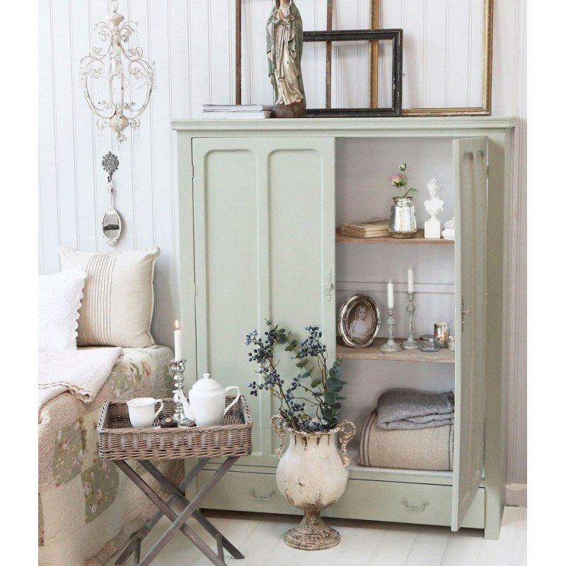Duża drewniana komoda w stylu prowansalskim w kolorze oliwkowym. Komoda posiada pojemną szufladę i dużą zamykaną szafkę z półkami. Drzwi i szuflady posiadają piękne ozdobne uchwyty. Takie stylowe meble, ocieplają wnętrze i dodają mu charakteru, przywołując myśl o prowansalskich wakacjach.