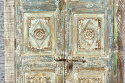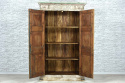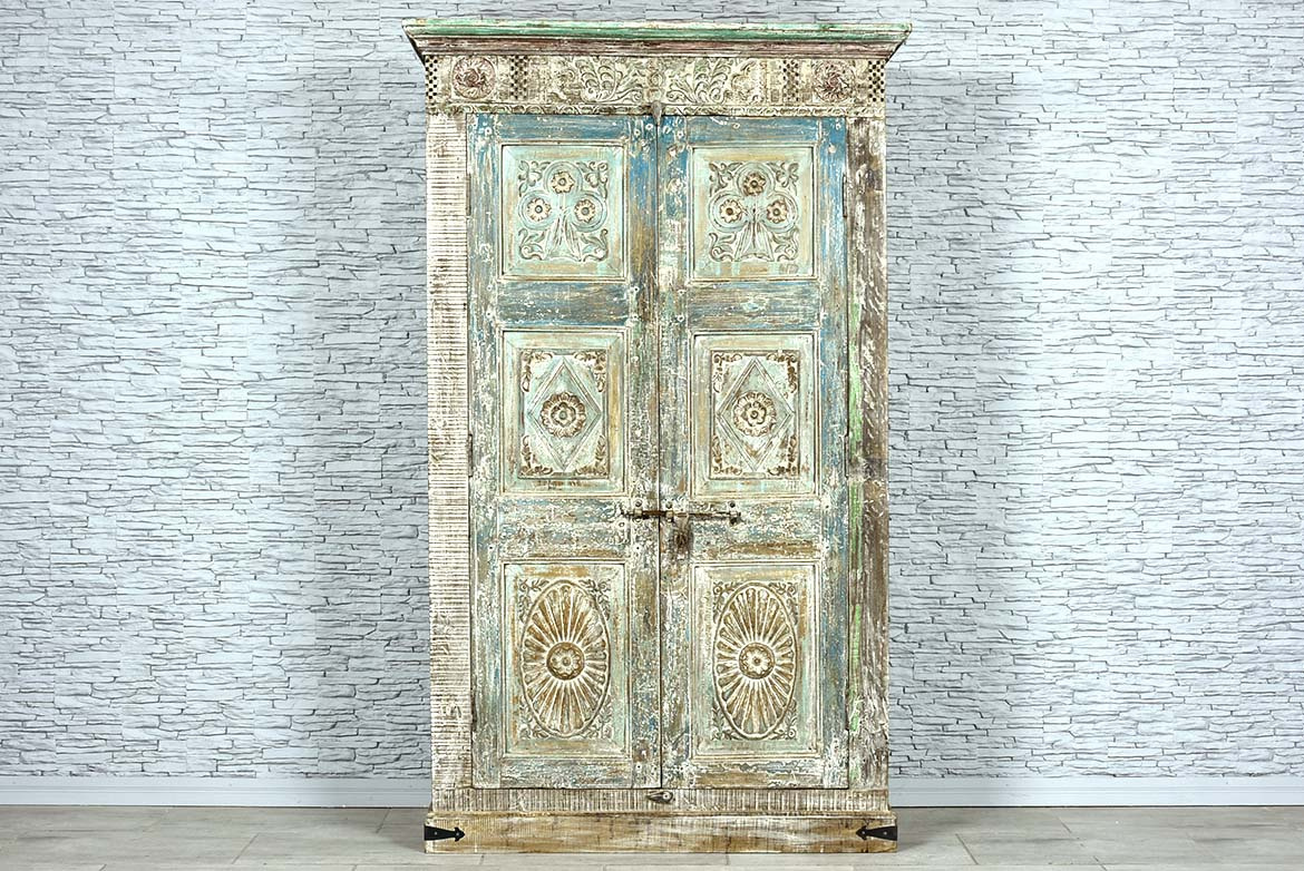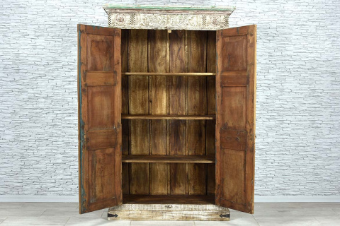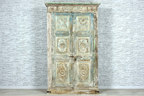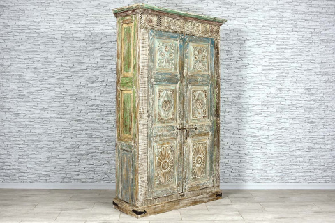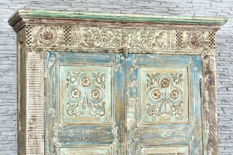 Duża, masywna szafa indyjska wykonana z drewnianych elementów recyklingowych, w małej manufakturze. Stare, antyczne, fronty o nierównej fakturze, zachwycają ręcznym rzeźbieniem i pięknymi pastelowymi odcieniami zieleni, niebieskości i bieli. Na górze szafę wykończono ozdobnym gzymsem. Mebel przecierany i delikatnie postarzony. Bielenie pięknie kontrastuje z kolorowym przodem. Rustykalne okucia w dolnej części są wspaniałym dopełnieniem wysmakowanej całości. Drzwi zamykane na duży skobel.