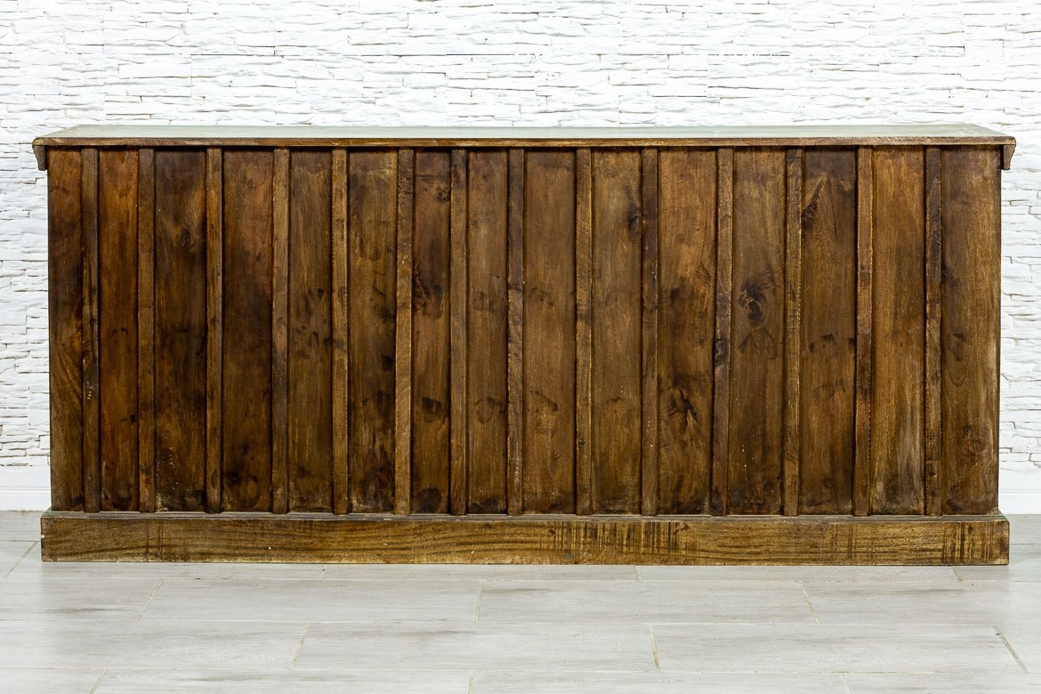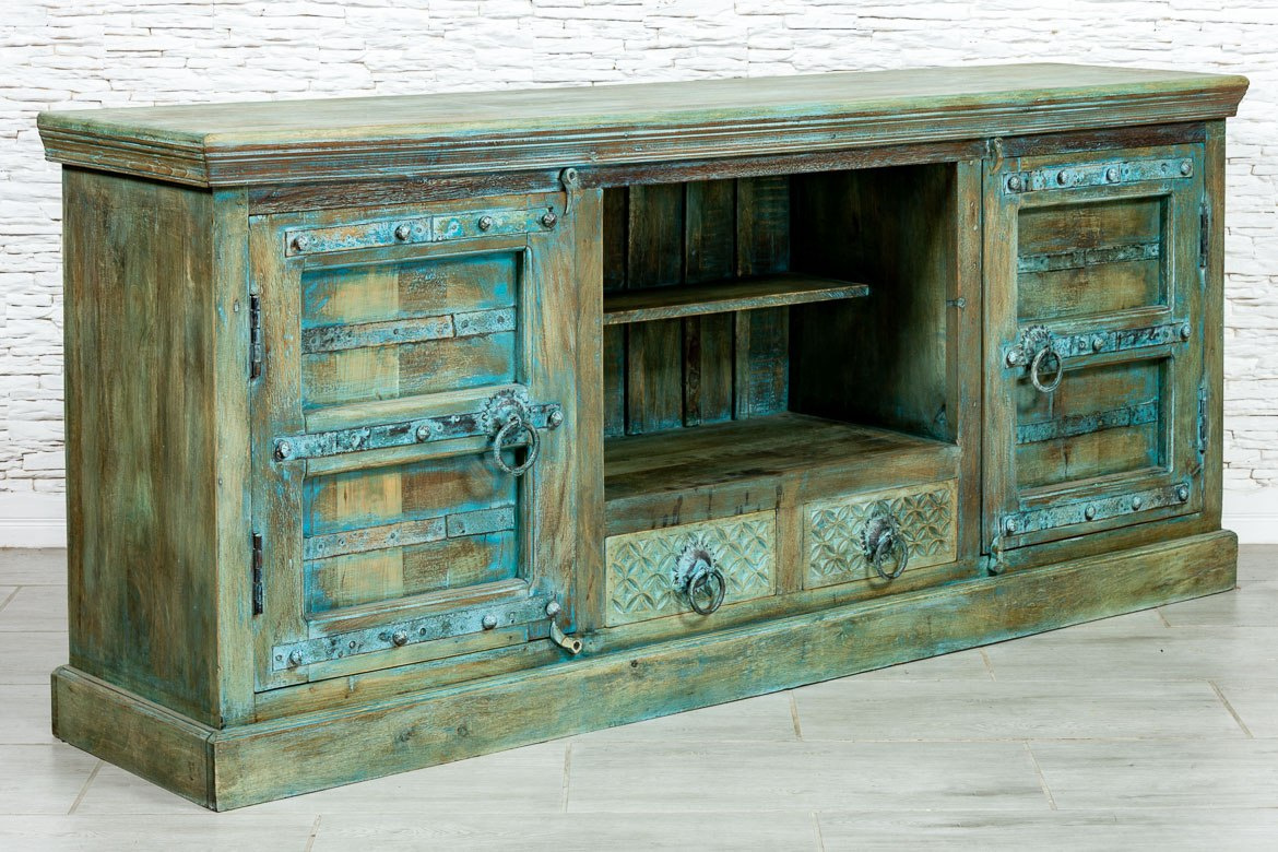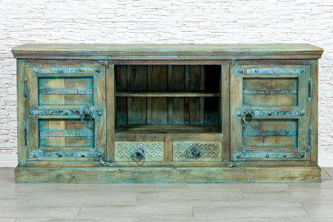 Szeroka, indyjska komoda RTV wykonana z drewna mango i pomalowana na odcień przepięknego turkusu z przetarciami. Mebel posiada dwa zamykane schowki, otwartą półkę i dwie małe szufladki. Fronty ozdobiono żelaznymi okuciami i uchwytami. Blat wyfrezowano i dodatkowo przetarto ranty. Szafka idealna pod telewizor do orientalnego salonu lub kolonialnej sypialni. Meble indyjskie wprowadzają do wnętrz wyjątkowy klimat i przepięknie pachną naturalnym drewnem.