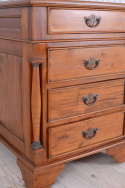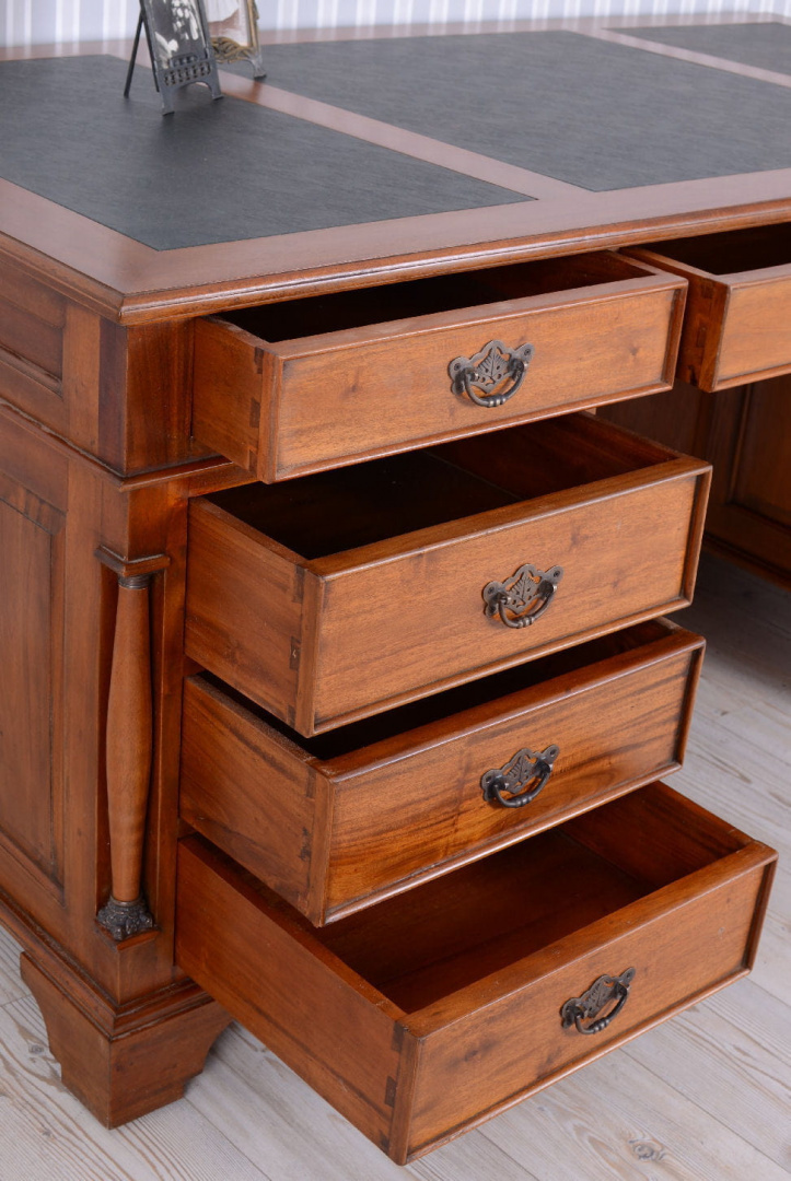 Biurko wykonane w całości z drewna mahoniowego i pomalowane na średni odcień brązu. Jest meblem niezwykle dekoracyjnym i wspaniale odnajdzie się w stylowym wnętrzu. Dopełnieniem tego wyjątkowego mebla są przepiękne uchwyty, doskonale korespondujące z jego charakterem. To stylowe biurko jest meblem dla konesera dobrego stylu i osoby ceniącej sobie topową jakość wykonania. Biurko posiada sześć szuflad i duży schowek.