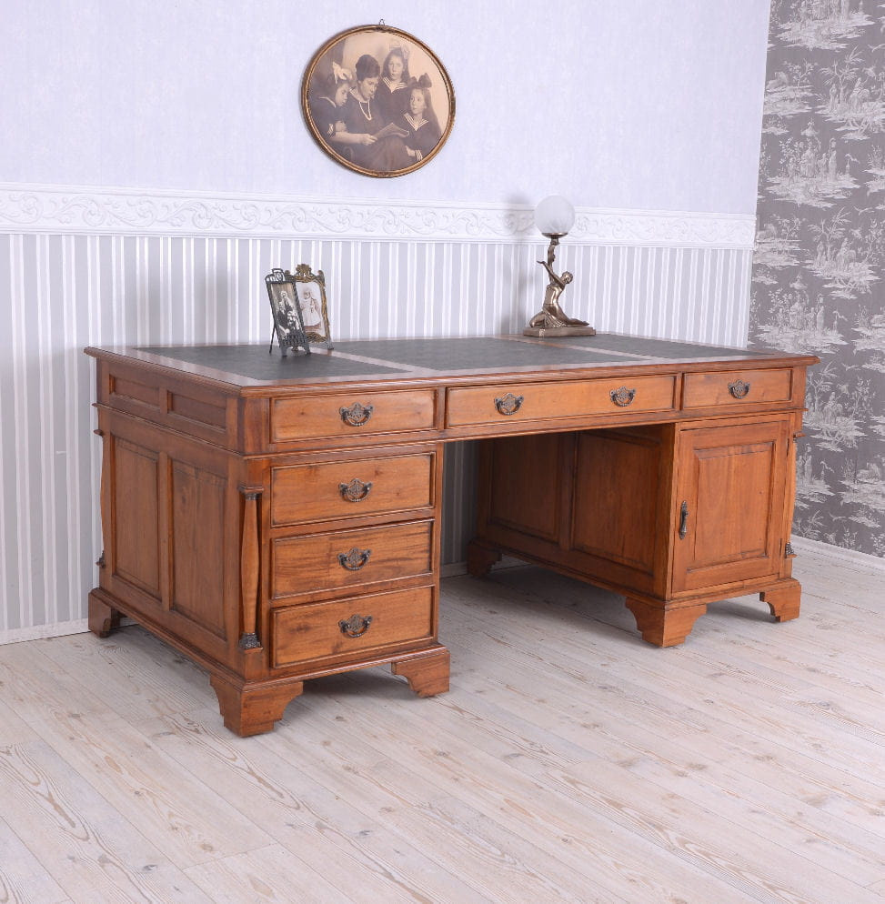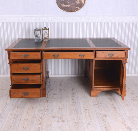 Duże, masywne biurko mahoniowe, stylizowane na mebel z dawnych lat.