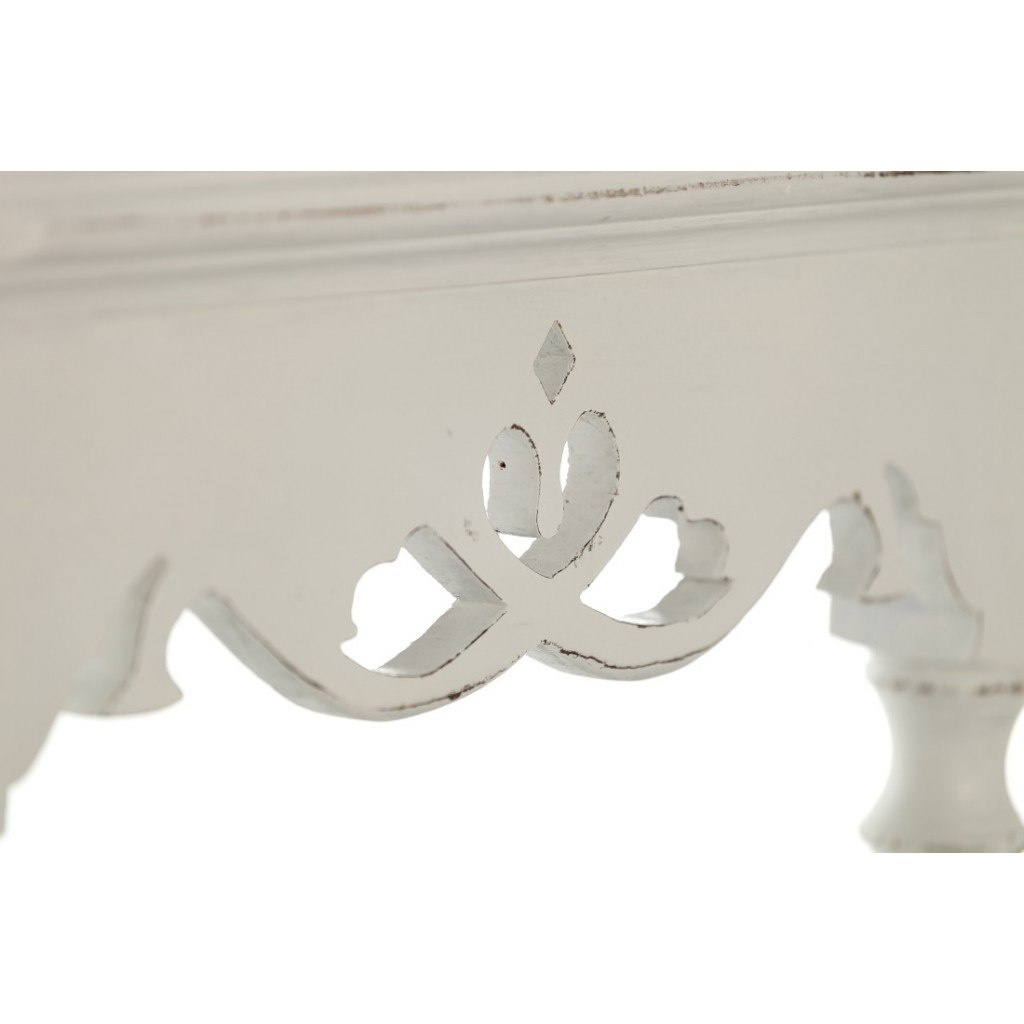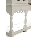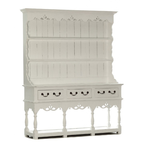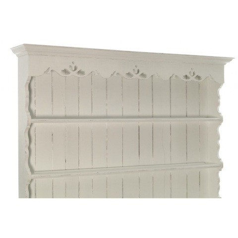 Stylowy, duży kredens z kolekcji MAZINE marki ALURO, to piękny rzeźbiony mebel, w stylu prowansalskim, w kolorze białym, stylizowany na postarzany. Ten biały unikatowy kredens z pewnością będzie cudowną ozdobą wnętrza. Posiada dwie otwarte półki, które pozwolą na wyeksponowanie np. ceramiki lub innej dekoracji. Kredens posiada trzy szuflady, ozdobione stylowymi uchwyty. Na dole kredensu znajduje się dodatkowa przestrzeń, którą też można zagospodarować.
