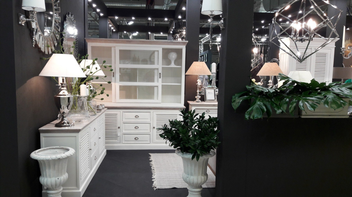 Przeszklona nadstawka posiada przesuwane drzwiczki. Dolna część za żaluzjowymi drzwiczkami przedzielona jest wbudowaną półką po obu stronach. Charakter mebla podkreślają delikatne przetarcia na drzwiczkach. Ciemniejsze elementy wykonano z pobielonego drewna mango oraz zaimpregnowano olejem. Bielone mango charakteryzuje się niejednolitą kolorystyką przenikających się szarości oraz bladego różu.