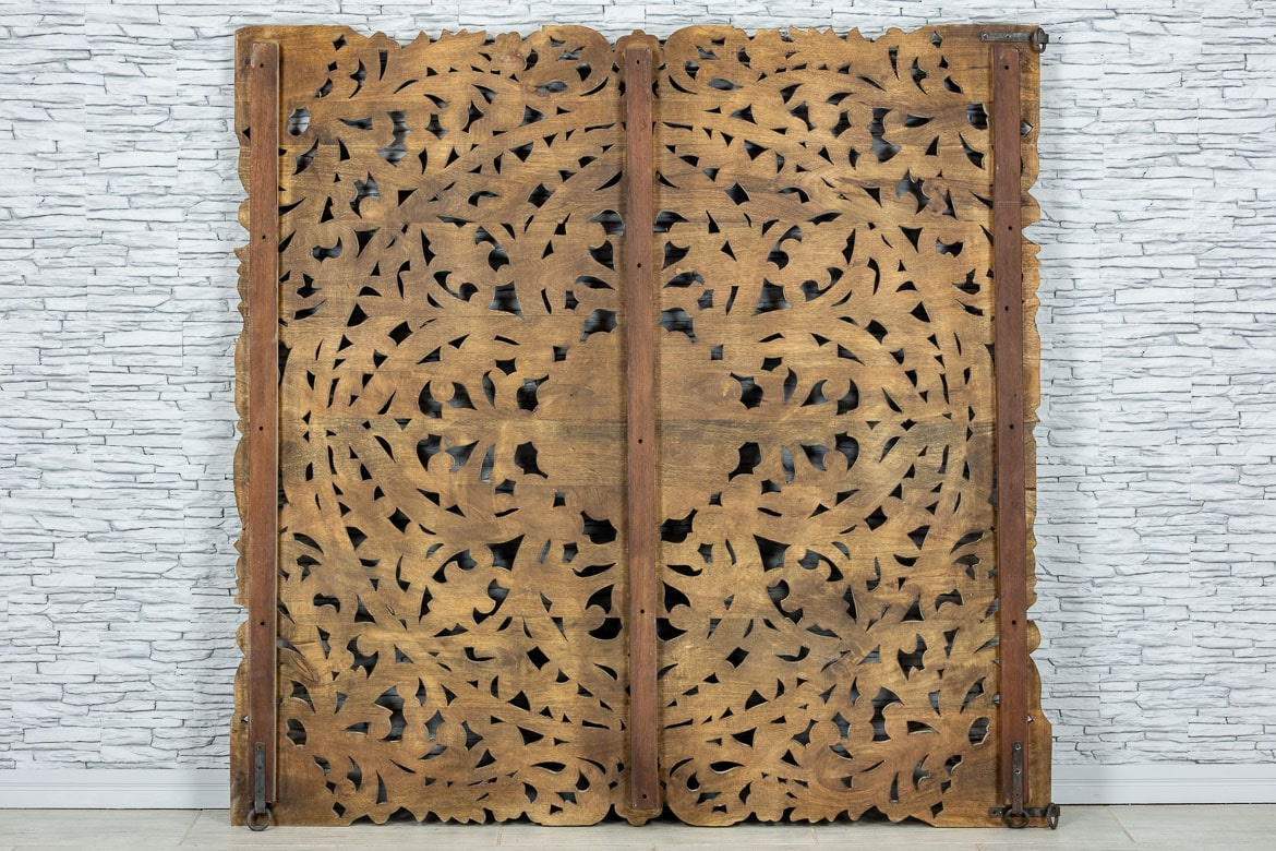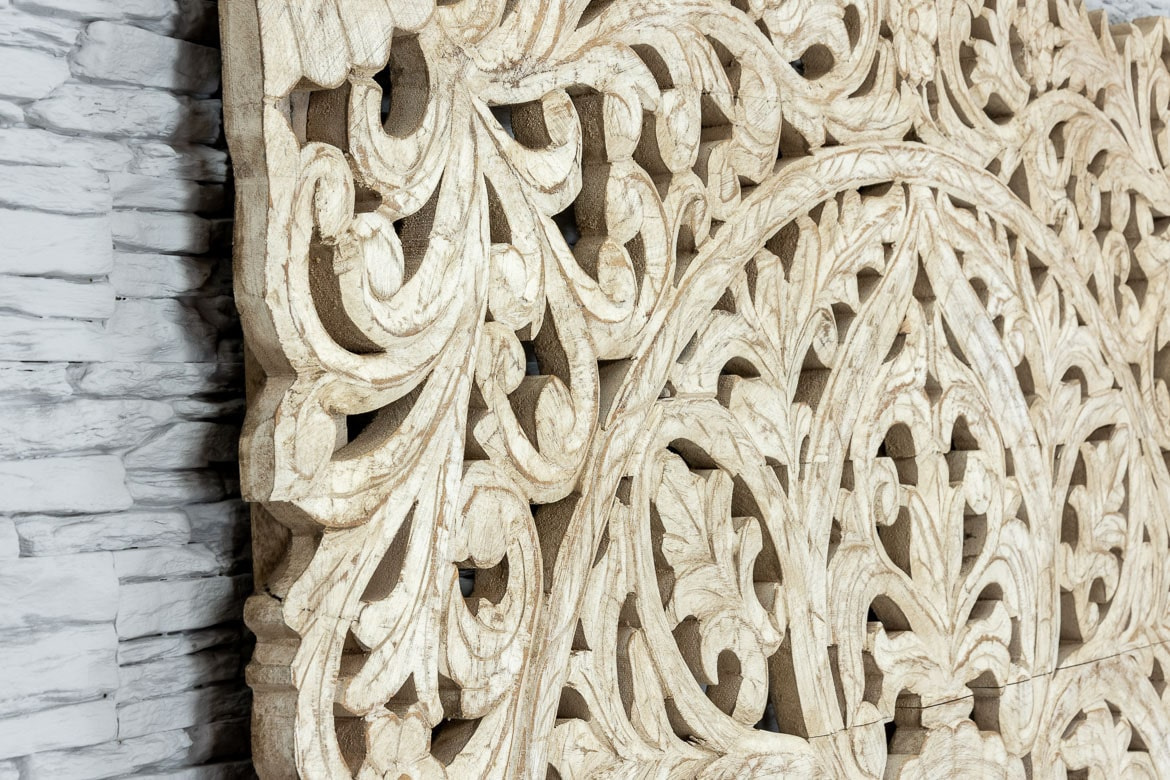 Panel wykonany z egzotycznego drewna mango w małej manufakturze w Indiach. Panel bielony i lekko przecierany oraz patynowany. To piękna ozdoba do Twojej sypialni lub salonu w stylu orientalnym. Ze względu na pokaźny rozmiar, polecamy do wysokich, przestronnych wnętrz.