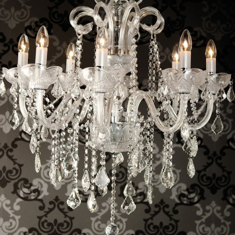 Żyrandol jest niezwykle dekoracyjny i ciężko przejść obok niego obojętnie. Posiada aż osiem źródeł światła dlatego pięknie doświetli nawet bardzo duże pomieszczenie. Polecamy szczególnie do wysokich, eleganckich, wysmakowanych wnętrz. Także do luksusowych hoteli, restauracji i salonów spa.