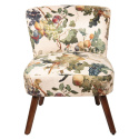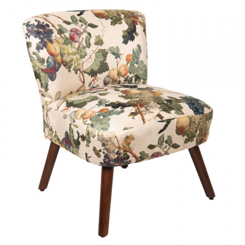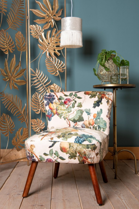 Urokliwy fotel inspirowany stylem art deco, tapicerowany owocową tkaniną w angielskim stylu. Fotel stworzony przez markę Clayre & Eef, która wspaniale połączyła zamiłowanie do stylu z dawnych lat ze współczesną techniką i funkcjonalnością. Wysokie, drewniane nóżki dodają mu lekkości i przełamują intensywność kolorowego printu.