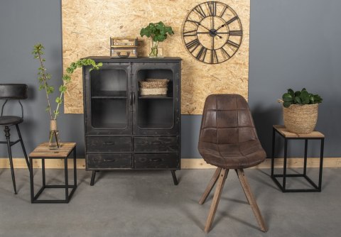 Ta designerska komoda w stylu industrialnym z topornym, fabrycznym wykończeniem, doskonale wpasuje się w surowe wnętrze. Witryna posiada duży, przeszklony schowek z półką i cztery dość pojemne szuflady, w których możesz schować np. sztućce lub inne przedmioty. Ten wyjątkowy mebel wspaniale wyeksponuje szkło lub ceramikę w loftowej kuchni, a także ozdoby i ramki ze zdjęciami w surowym industrialnym salonie.