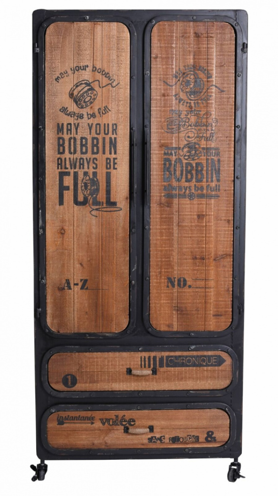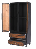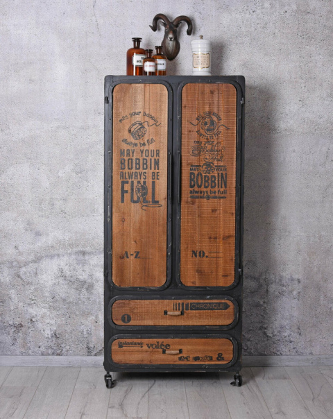 Industrialna, wysoka drewniana szafa na metalowych kółkach.