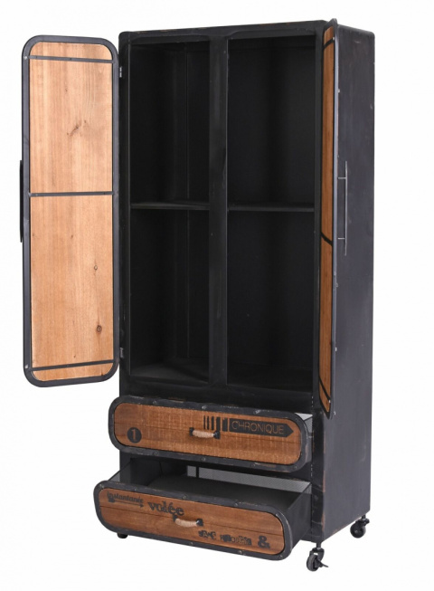 Ten wyjątkowy mebel to idealna propozycja do aranżacji fabrycznych i loft. Czarny kolor w połączeniu brązowym odcieniem drewna to stylistyczny strzał w dziesiątkę. Całość została specjalnie postarzona, dla uzyskania autentycznego efektu mebla z fabryki. Szafka na zgrabnych kółkach, które oprócz walorów estetycznych, pozwolą Ci łatwo utrzymać czystość pod meblem lub w razie potrzeby przesunąć go w inne miejsce. Posiada schowek z półką i dwie szuflady.