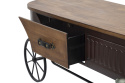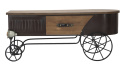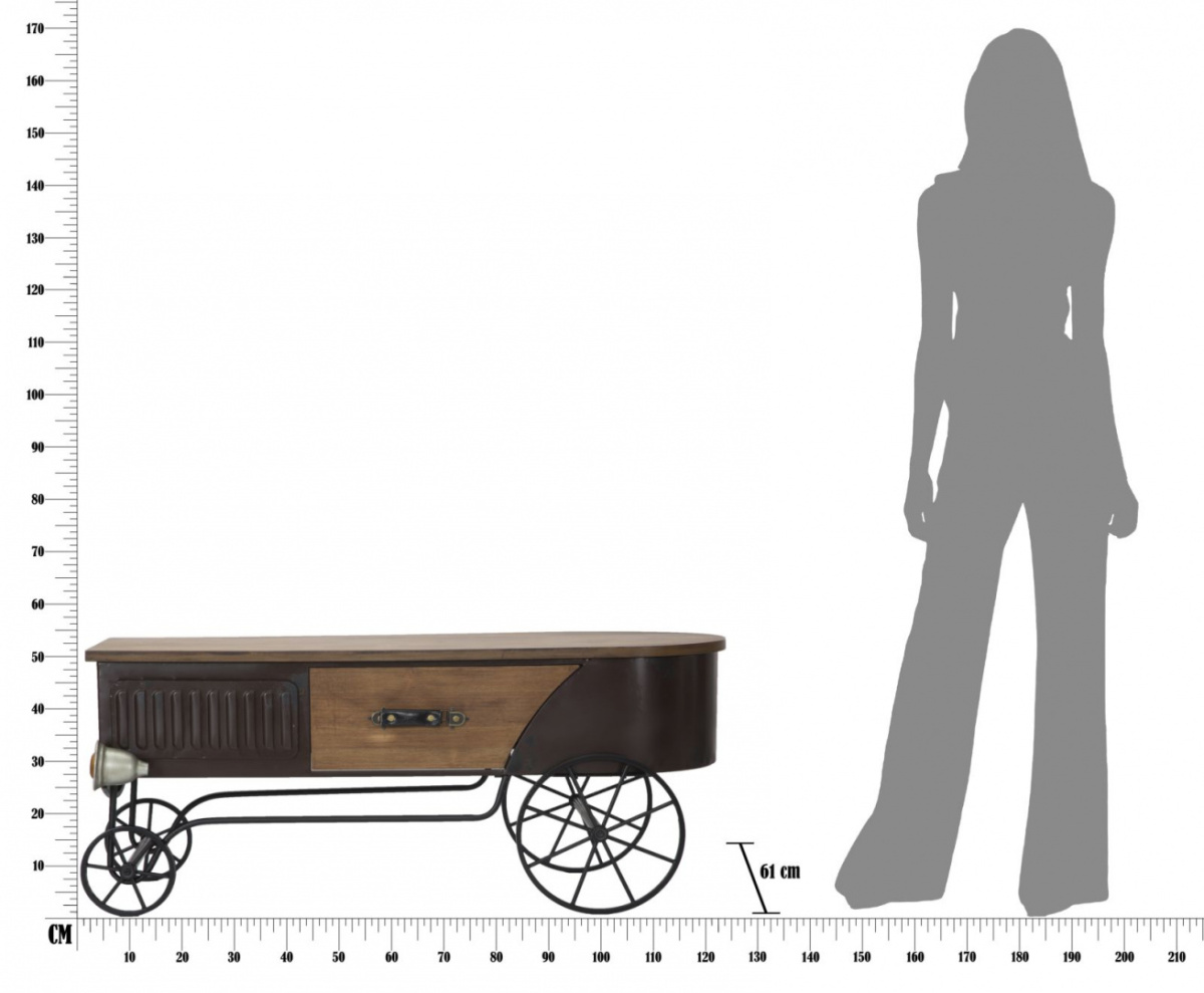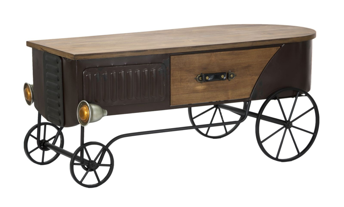 Mebel stylizowany na stary samochód z XIX wieku. Opływowy korpus z blatem, osadzono na stylizowanych kołach. Umiejętnie zestawiono tu faktury i kolory, dlatego mebel robi tak ogromne wrażenie. Pojemne szuflady są idealnym miejscem na przechowywanie czasopism czy gier planszowych.