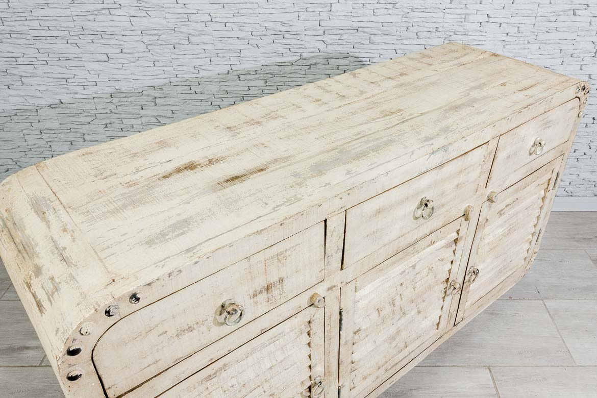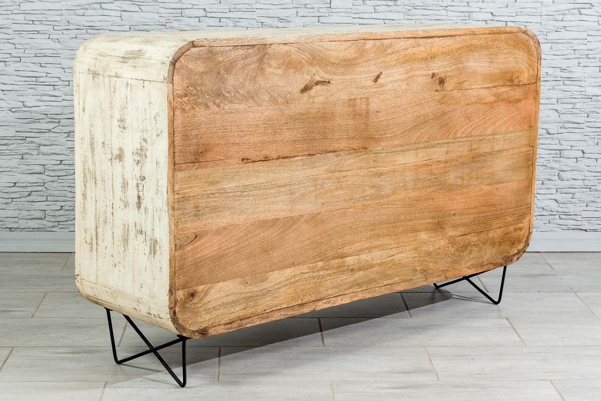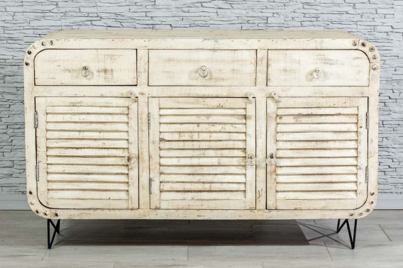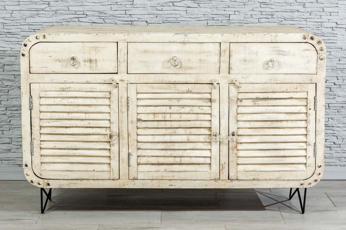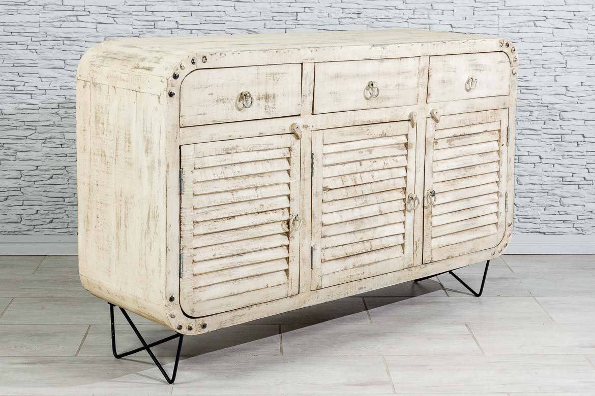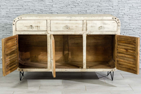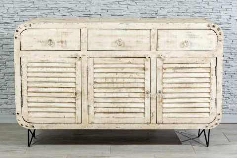 Biała, indyjska komoda z drewna mango i metalu. Kształt mebla inspirowany jest latami 60-tymi. Komoda została pomalowana na kremowy odcień bieli z licznymi przetarciami. Żaluzjowe fronty przepięknie komponują się z jasnym odcieniem. Czarne, loftowe nóżki i okucia na rantach idealnie kontrastują z bielą dodają całości industrialnego charakteru. Ta przepiękna komoda łączy w sobie świetny design i funkcjonalność. Posiada dużą przestrzeń do przechowywania w schowkach, a dodatkowo ma trzy szuflady w górnej części. Polecamy do wnętrz orientalnych, vintage, a także loft/industrial.