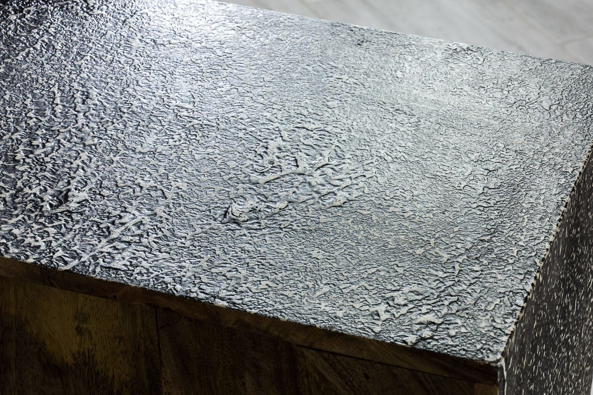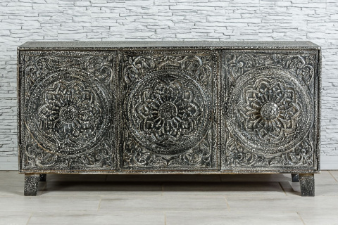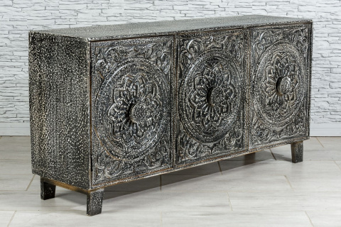 Ozdobne fronty z wyrzeźbionymi mandalami tworzą trójwymiarowy efekt. Mebel ma kolor czarno-biały i pomalowany został wypukłą farbą strukturalną, której właściwości widać na przedostatnim zdjęciu. Komoda posiada duże schowki z półkami, które z łatwością pomieszczą wiele przedmiotów. Jest bardzo uniwersalna, więc sprawdzi się właściwie wszędzie. Idealna zarówno do salonu, sypialni, przedpokoju czy nawet do orientalnego biura. Polecamy zestawić z innymi meblami indyjskimi dostępnymi w naszej ofercie.