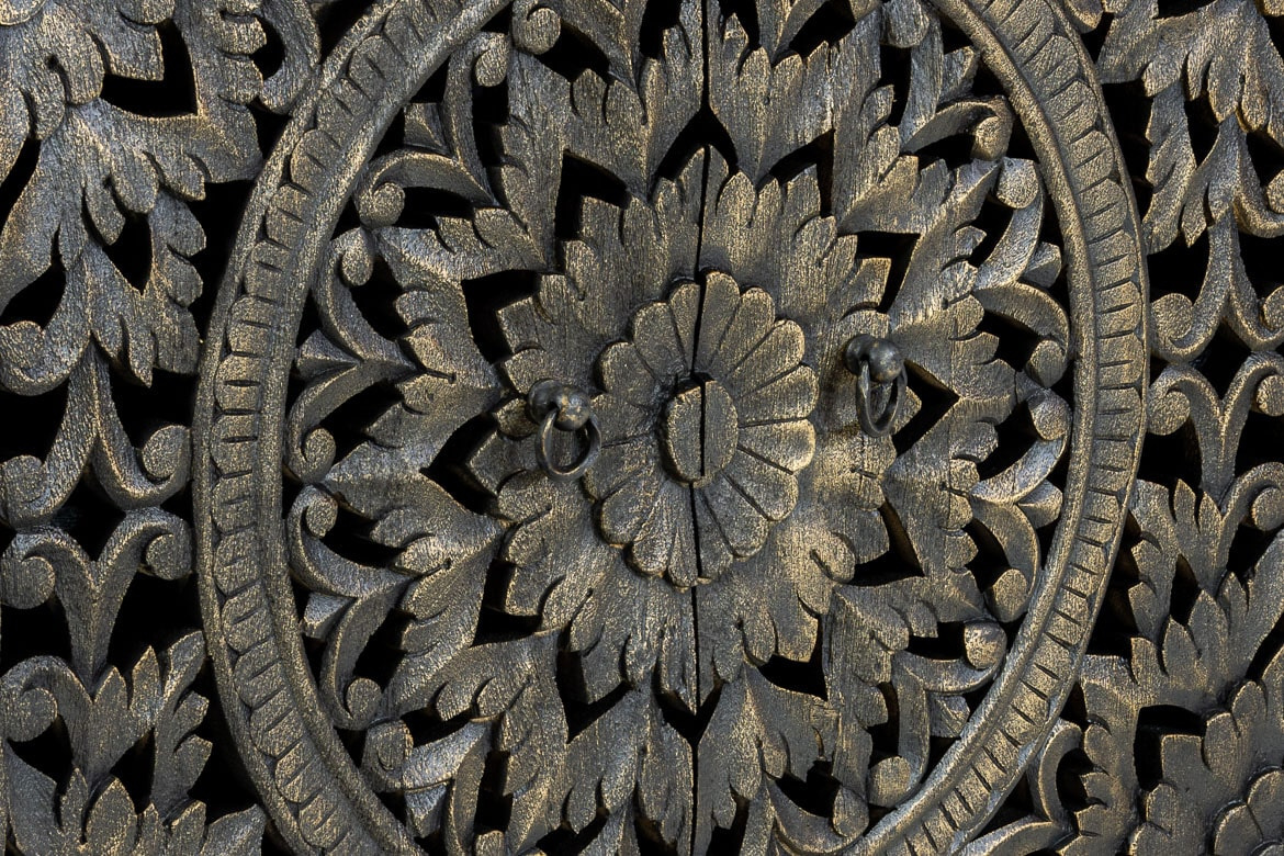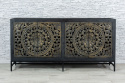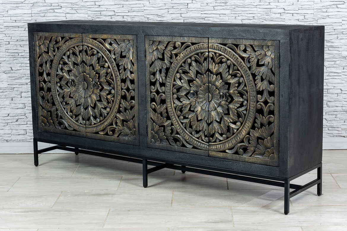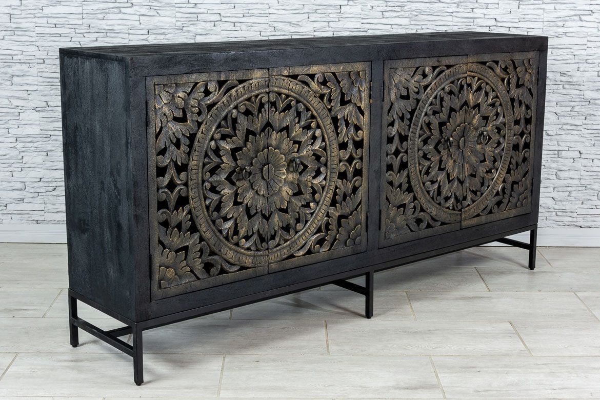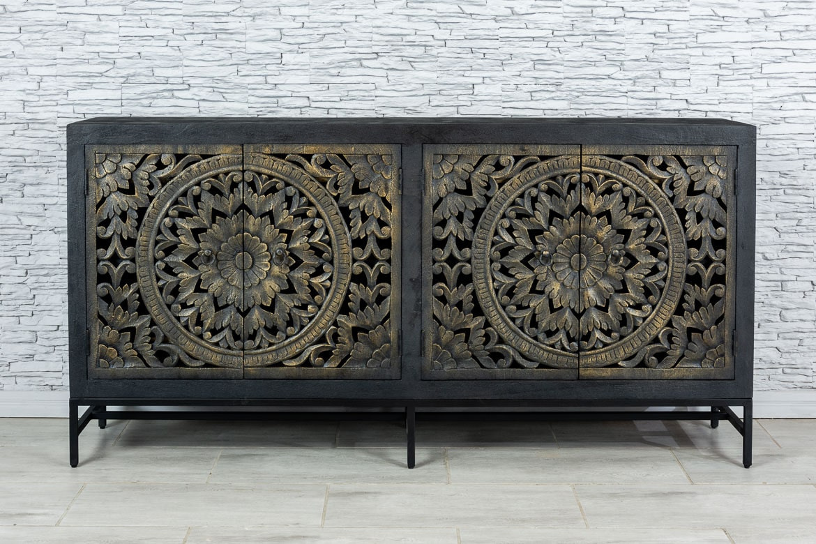Ażurowe, ozdobne fronty z wyrzeźbionymi mandalami, delikatnie pomalowano na odcień starego złota i przetarto. Pozostała część mebla ma kolor czarny w matowym wykończeniu. Komoda posiada dwa niezależne schowki z półkami, które z łatwością pomieszczą wiele przedmiotów.