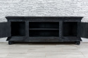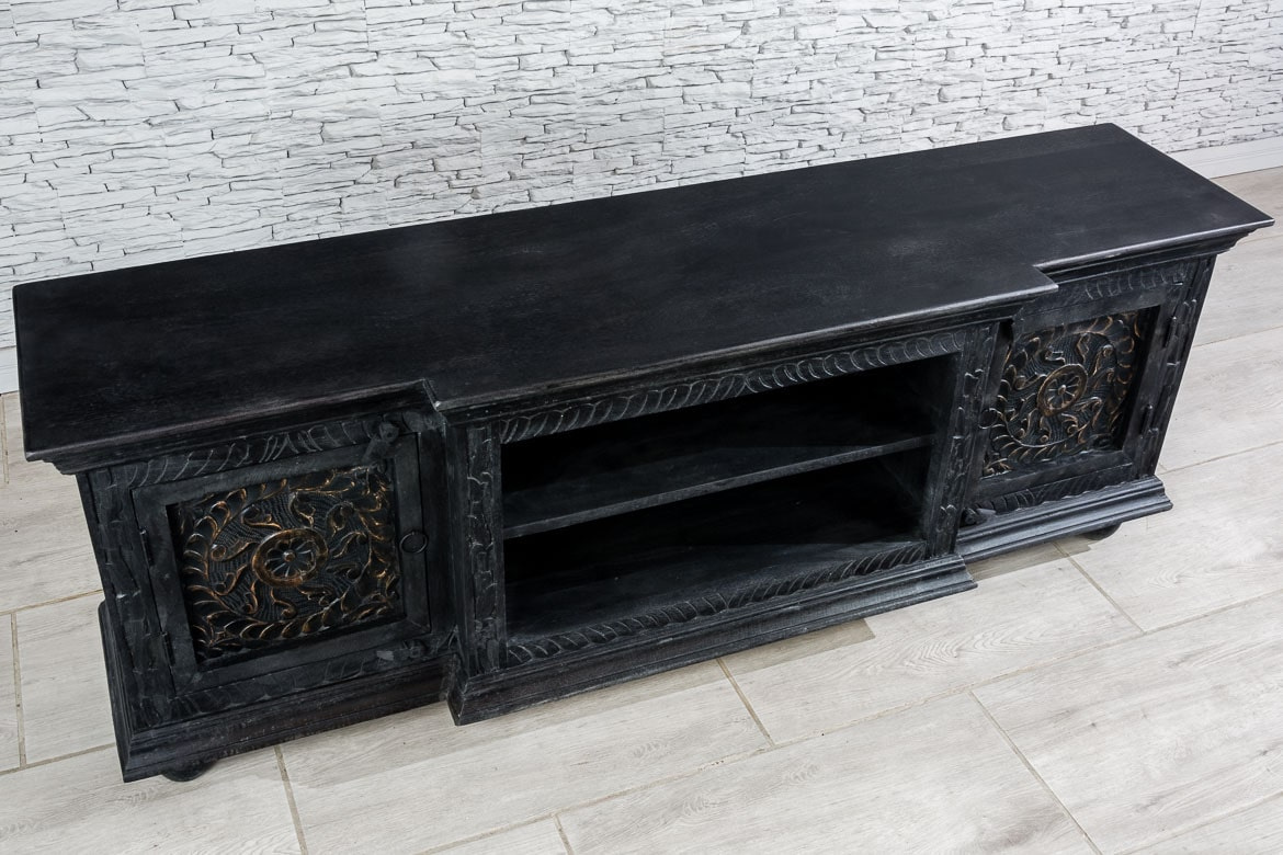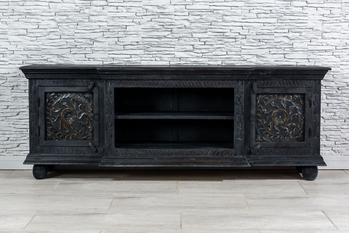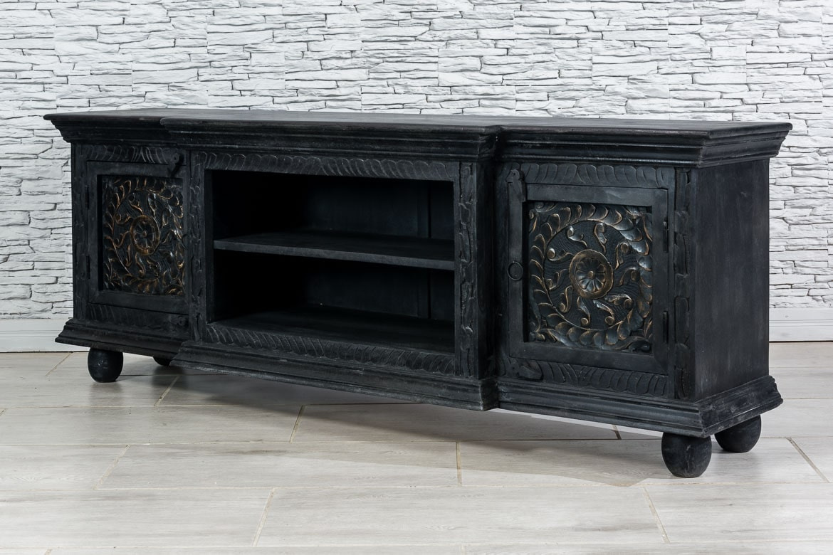 Indyjska, czarna szafka RTV ze złotymi mandalami w stylu orientalnym.