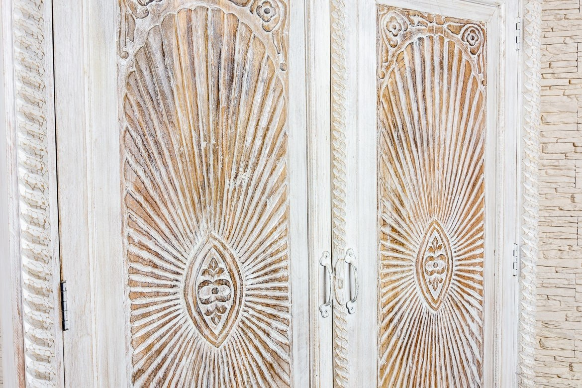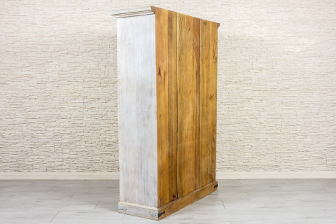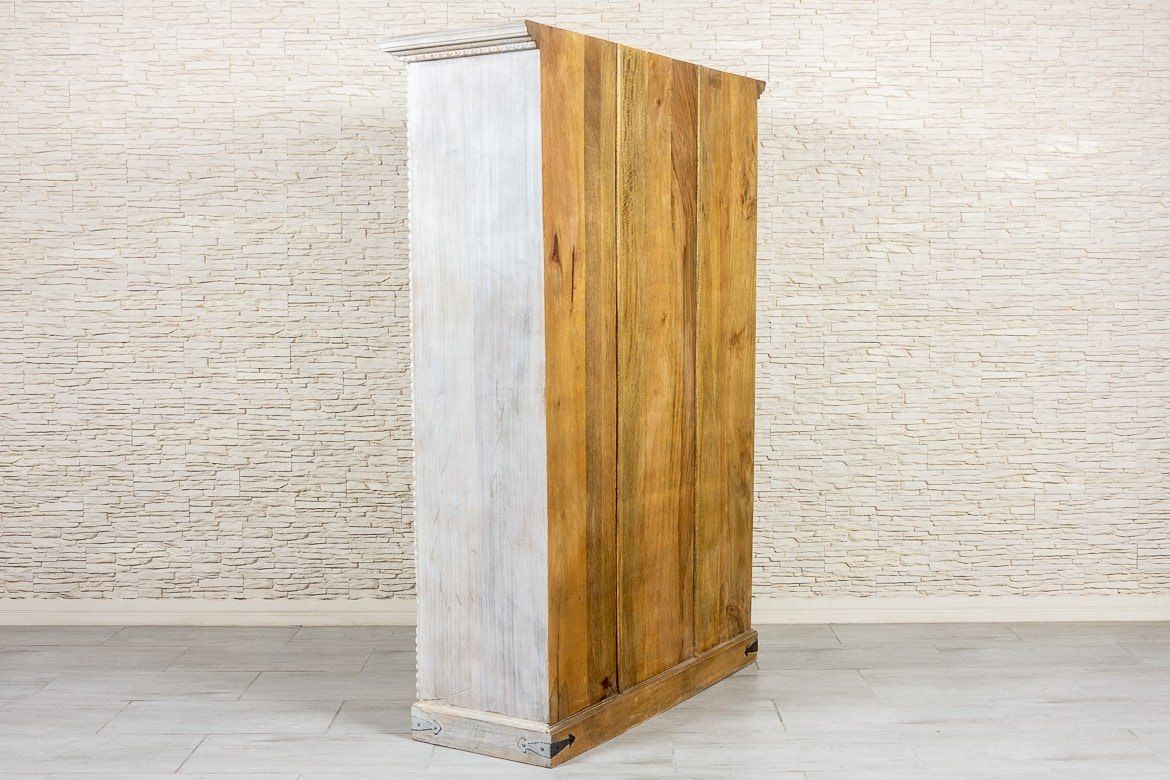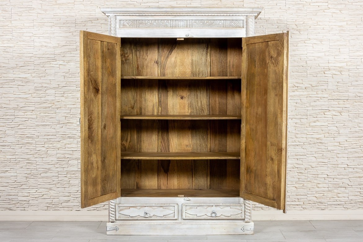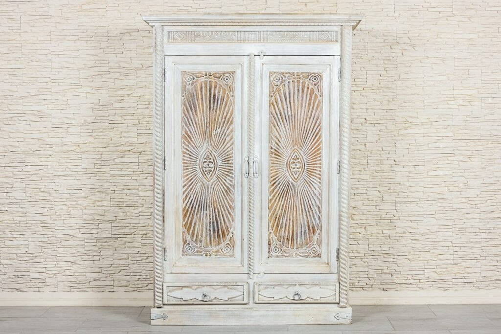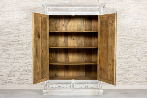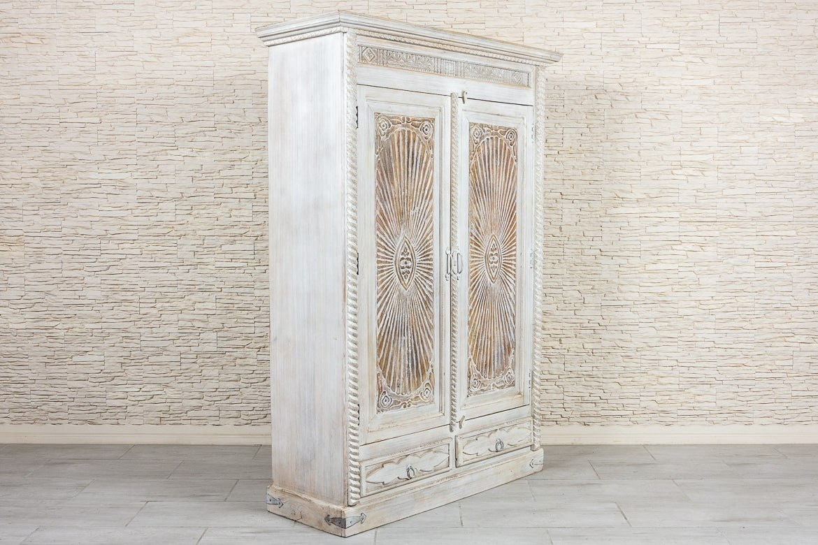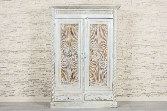 Duża, bielona szafa indyjska z drewna mango zdobiona w stylu antycznym. Piękne, rzeźbione fronty z motywem słońca, zostały przetarte i postarzone. Dzięki nierównej fakturze i niejednolitemu odcieniowi farby szafa zyskuje bardziej trójwymiarowy wygląd. Na górze szafę wykończono ozdobnym gzymsem, boki rustykalnym warkoczem, a dolną listwę urozmaicono rustykalnymi okuciami. Szafa posiada wewnątrz głębokie półki oraz dwie szuflady w dolnej części. Jest niezwykle pojemna i z łatwością pomieści wiele przedmiotów. Polecamy do przestronnych wnętrz w stylu orientalnym lub kolonialnym.