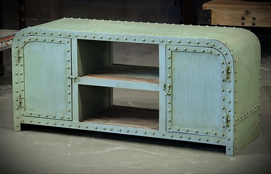 Designerska szafka w stylu loftowym, wykonana z grubej blachy pancernej, nitowana. Szafka posiada dwa zamykane schowki bez półek i dwie otwarte półki na sprzęt. Na powierzchni uzyskano odcień patynowanego metalu - kolor między zgaszoną miętą, a seledynem. Ten mebel, to połączenie stylu loftowego i orientalnego. Polecamy do surowych wnętrz industrialnych. Jeśli potrzebujesz więcej zdjęć, skontaktuj się z nami.