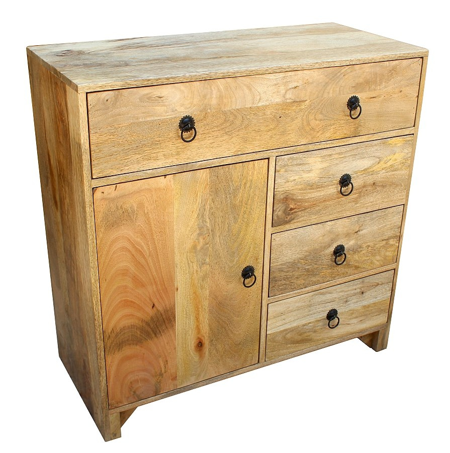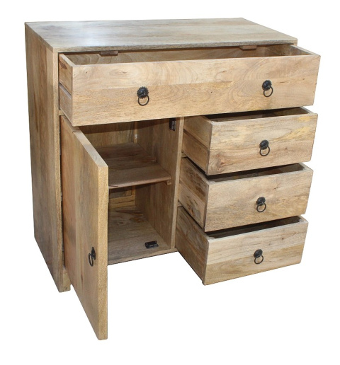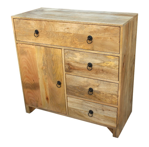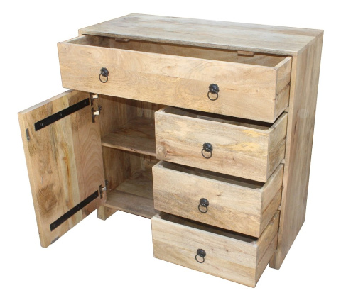 Drewniana komoda z szufladami, wykonana ręcznie w indyjskiej manufakturze. Drewno mango, z którego została zrobiona, to piękny i trwały surowiec wysokiej jakości. Mebel zawiera cztery szuflady i pojemny schowek. Wszystkie fronty wykończono ozdobnymi uchwytami w stylu rustykalnym. Komoda łączy w sobie praktyczność i dobry styl. Sprawdzi się zarówno we wnętrzach stylizowanych na modłę kolonialną jak również w nowoczesnych przestrzeniach.