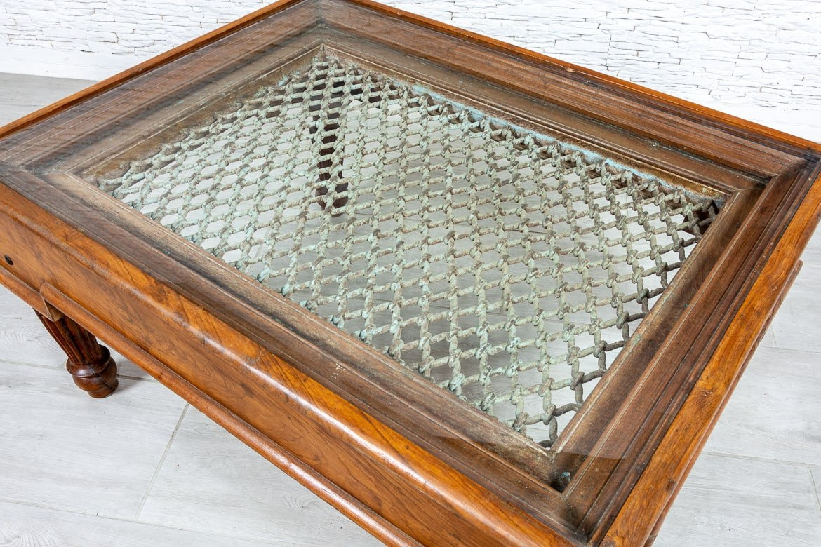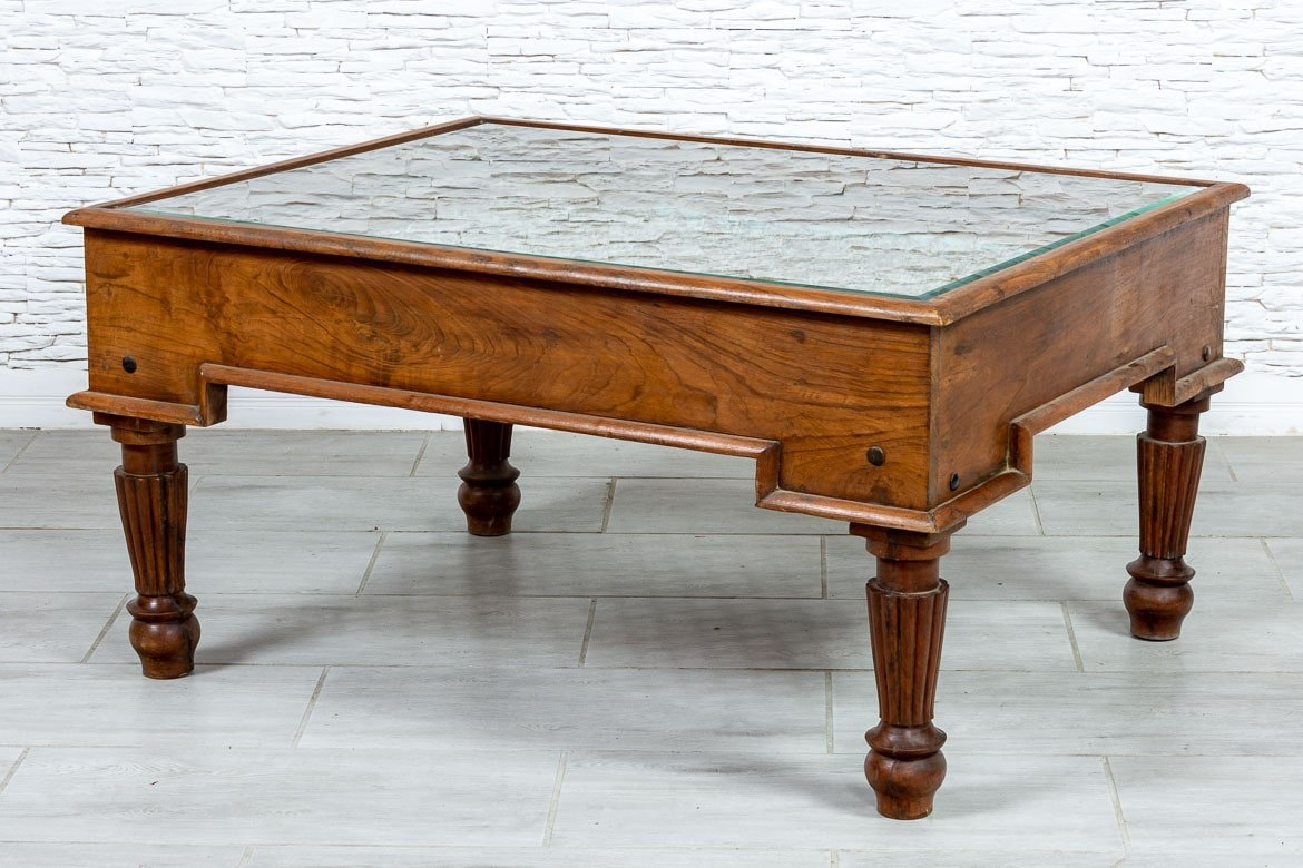 Indyjski, masywny stolik kawowy z drewna tekowego. Piękne, toczone nogi trzymają wysoki, ozdobny blat, w który wkomponowano starą, żelazną kratę i przykryto fazowaną szybą. Jest na tyle duży, że spokojnie zagrasz z gośćmi w planszówki lub wypijesz popołudniową kawę w większym gronie. Mebel łączy w sobie wyjątkowy styl i funkcjonalność. Stolik odnajdzie się szczególnie we wnętrzach kolonialnych i orientalnych.