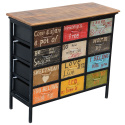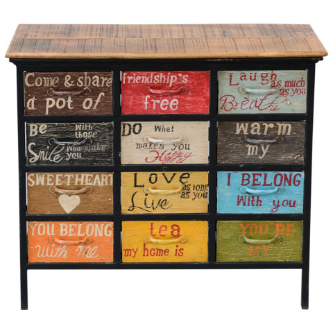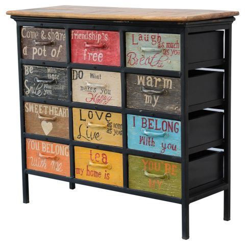 Loftowa komoda indyjska z kolorowymi szufladami. Metalową, surową konstrukcję połączono z drewnianym blatem i intensywnymi kolorami. To ciekawe zestawienie przypadnie do gustu wielbicielom niebanalnych form. Każda z dwunastu szuflad została ozdobiona pozytywnymi i romantycznymi tekstami w języku angielskim. Mebel idealny dla pary. Odnajdzie się w każdym pomieszczeniu.