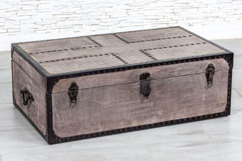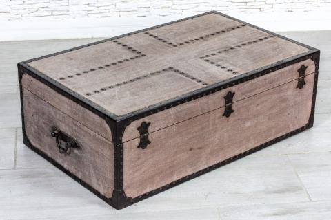 Unikatowy kufer indyjski wykonany ze sklejki pokrytej płótnem bawełnianym w odcieniu brudnego różu wpadające we wrzos. Skrzynię wykończono żelaznymi uchwytami i zawiasami, a także ozdobiono ją ćwiekami. Na wieku widoczny jest wzór krzyża. Taki kufer może być schowkiem, siedziskiem, a także stolikiem kawowym. Polecamy do wnętrz orientalnym, kolonialnych i loft.