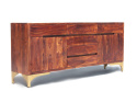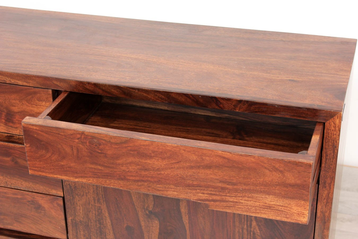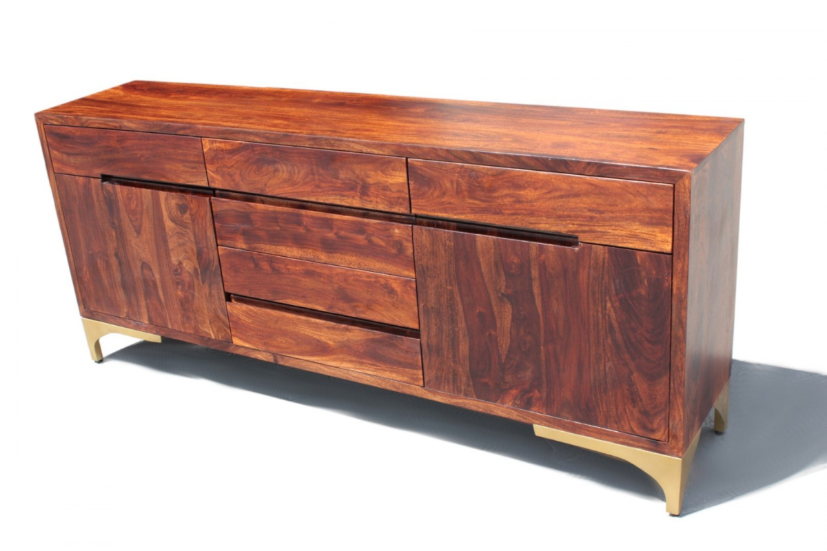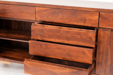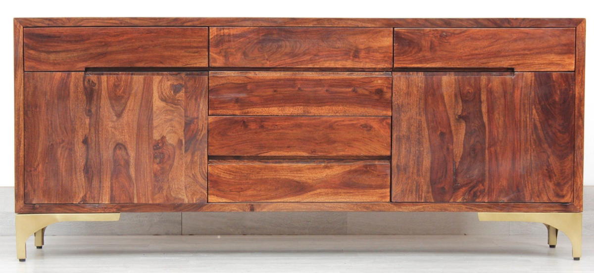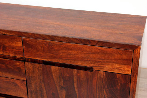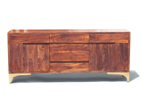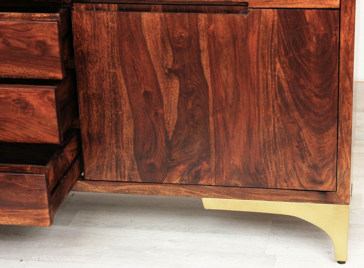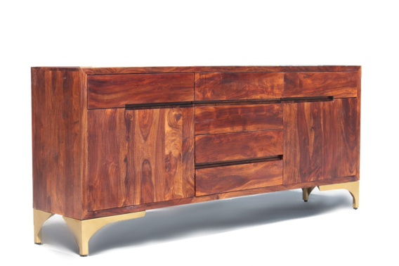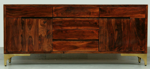 Stylowa, szeroka komoda na złotych nóżkach, wykonana w Indiach z litego drewna palisandru indyjskiego - surowca słynącego z trwałości i odporności na uszkodzenia mechaniczne. Ciepłe, brązowe wybarwienie ukazuje niezwykłe piękno naturalnej deski i oryginalny charakter wyrazistych słoi. Ta stylowa komoda posiada sześć szuflad i dwie szafki z półkami. Łączy w sobie funkcjonalność i dobry styl.
