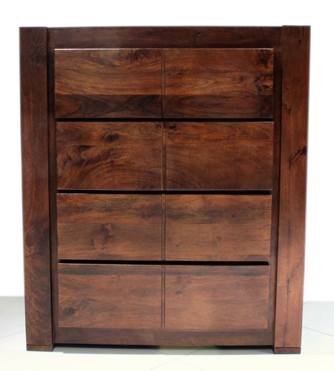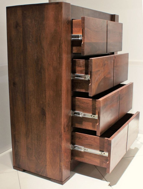 Faktura egzotycznego drewna sprawia, że mimo swojej prostej formy, jest bardzo oryginalna. Komoda wykonana w całości z litego drewna oraz wykończona lakierem satynowym. Komoda wykonana w malej manufakturze w Indiach. Z pewnością sprawdzi się w eleganckim wnętrzu i zadowoli najbardziej wymagającego użytkownika. Łączy w sobie funkcjonalność i dobry styl. Komoda posiada cztery głębokie, pojemne szuflady.