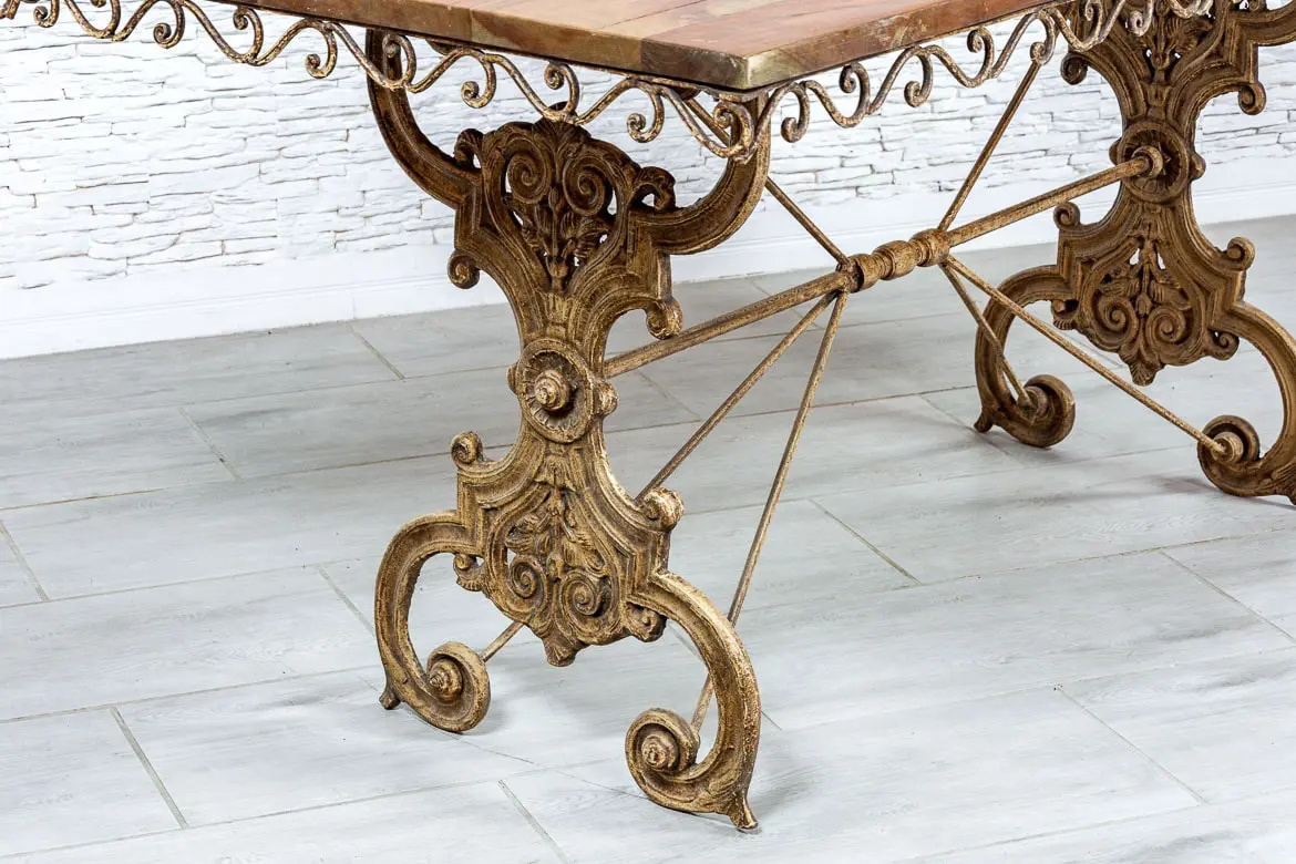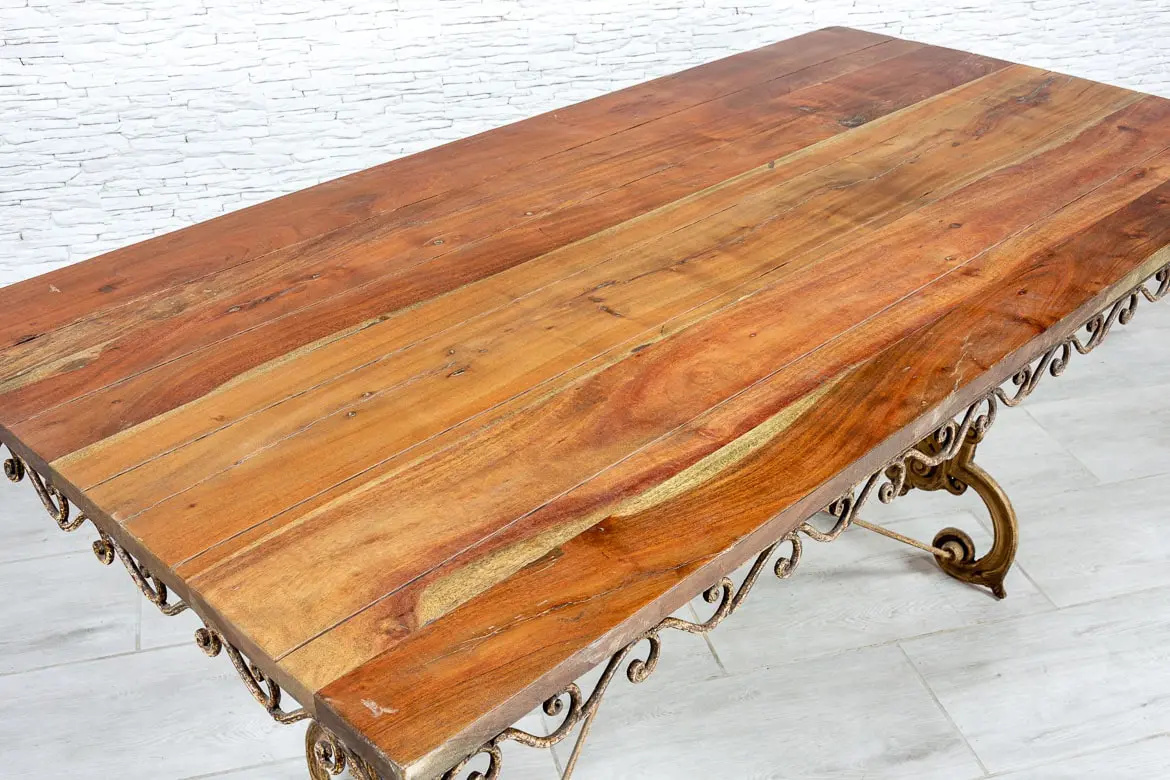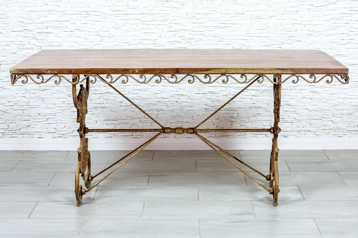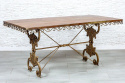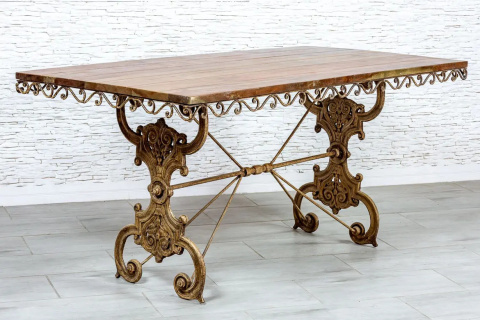 Stół niezwykle dekoracyjny i strojny. Jego drewniany blat wykończono ażurową żelazną "koronką", który przepięknie komponuje się z wysmakowaną całością. Stół zachwyca kształtem i nietuzinkowym stylem. Przepięknie ozdobi przestronną jadalnie w oryginalnym wnętrzu. Taki stół odnajdzie się szczególnie w aranżacjach orientalnych, kolonialnych i vintage.