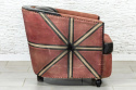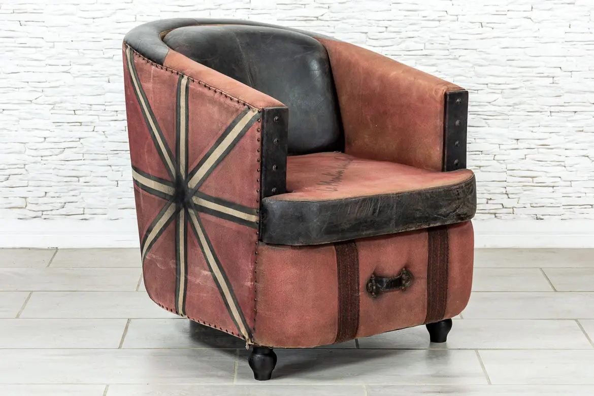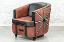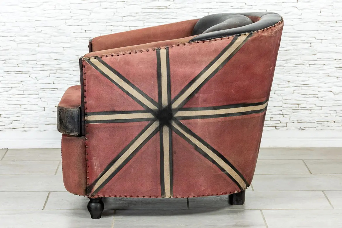 Fotel celowo przecierany i postarzany dla uzyskania efektu vintage. Ma oryginalny kształt i jest niezwykle wygodny. Zewnętrzna strona fotela inspirowana jest flagą Wielkiej Brytanii. Na siedzisku umieszczono duży napis, a na podłokietnikach dodatkowo ozdobiono go dekoracyjnymi ćwiekami. Dzięki swojemu ponadczasowemu designowi jest również bardzo uniwersalny stylistycznie.