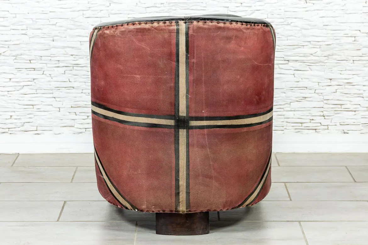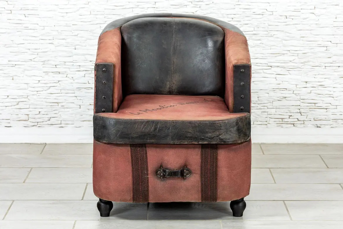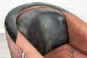 Głęboki, skórzany fotel indyjski, tapicerowany grubym płótnem i skórą naturalną.