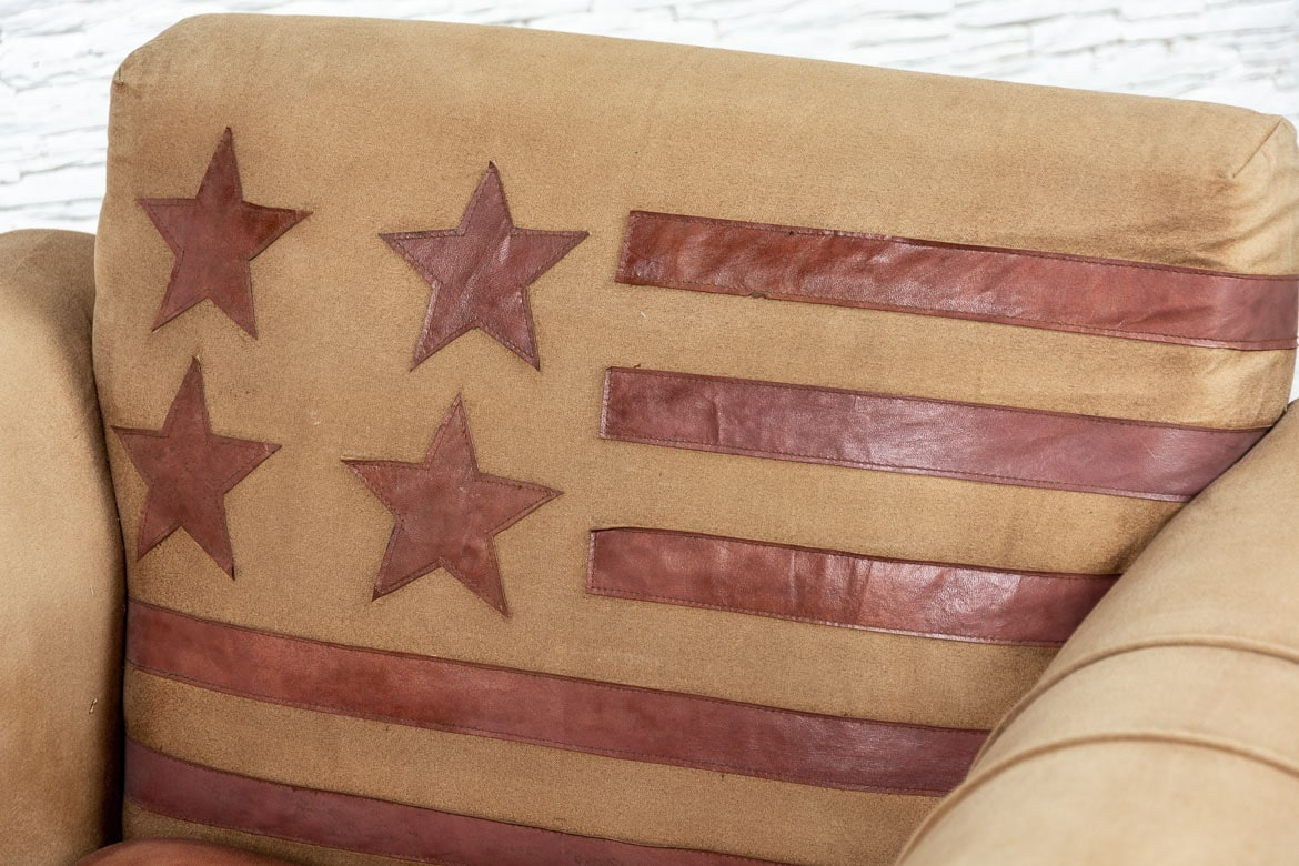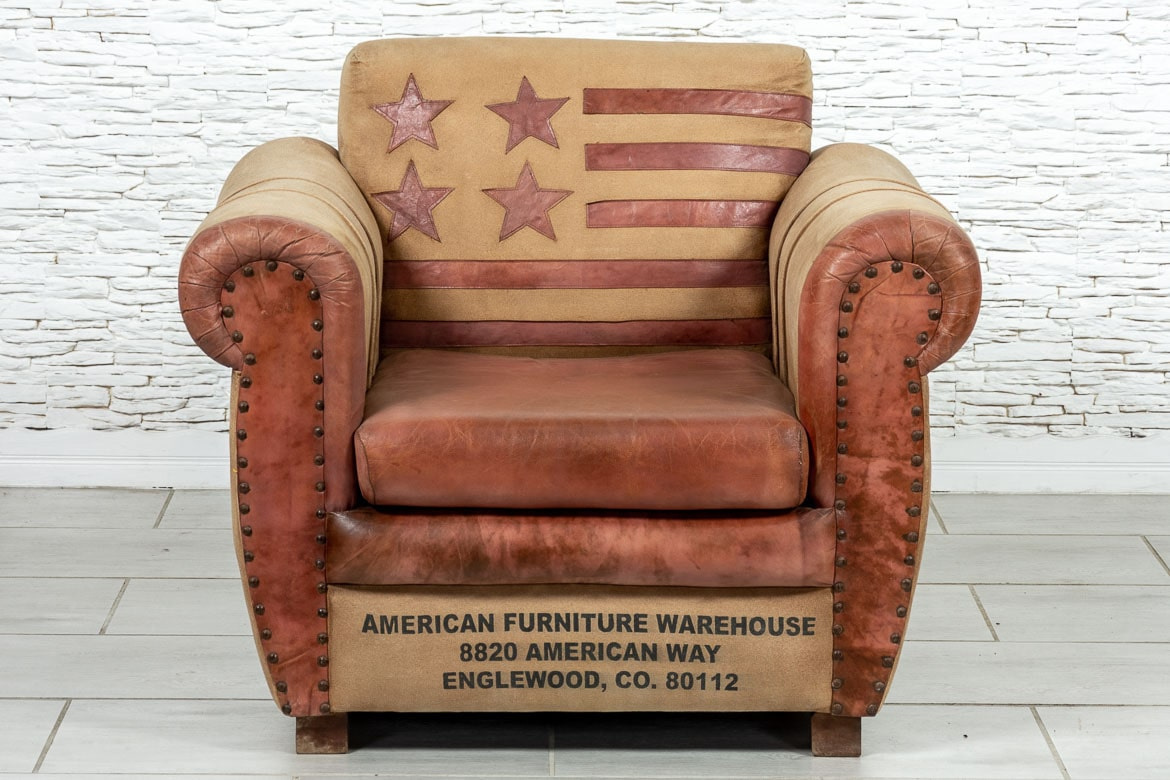 Oryginalny fotel indyjski z flagą USA, tapicerowany skórą naturalną i grubym płótnem. Ma klasyczny kształt i jest niezwykle wygodny. Stylowe podłokietniki i plecy mebla ozdobiono dodatkowo mosiężnymi ćwiekami. Dzięki swojemu nietuzinkowemu designowi jest również bardzo uniwersalny stylistycznie.