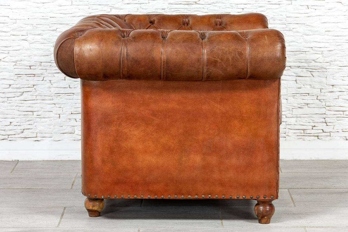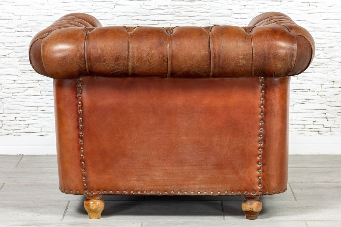 Pikowany duży fotel indyjski typu Chesterfield, tapicerowany skórą naturalną.