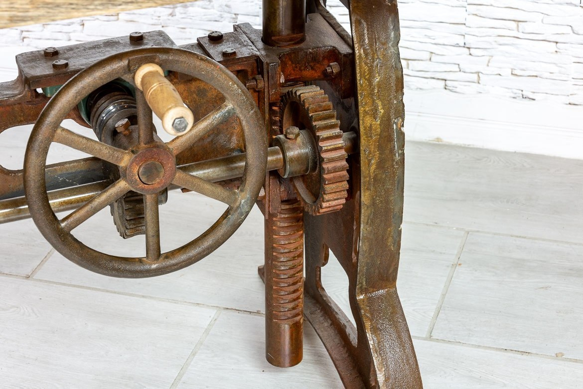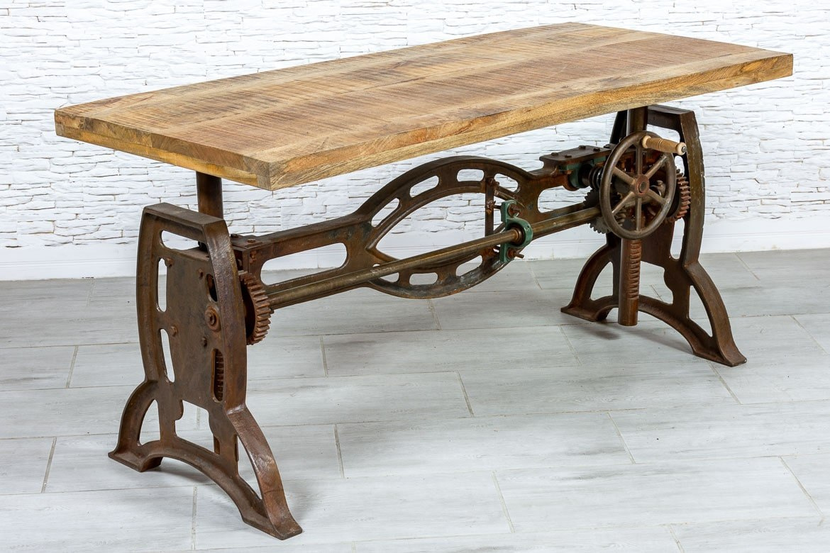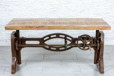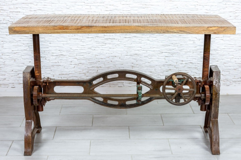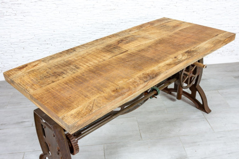 Indyjski stół industrialny na ciężkiej, żelaznej podstawie rustykalnej z korbą i przekładaniami ślimakowymi, odpowiadającymi za regulację wysokości. Blat wykonano z litego drewna mango w naturalnym jego odcieniu. Toporne wykończenie idealnie wpisuje się we współczesne trendy. Przy stole może usiąść komfortowo sześć osób. Polecamy do wnętrz loft/industrial i rustykalnych