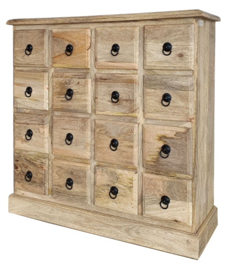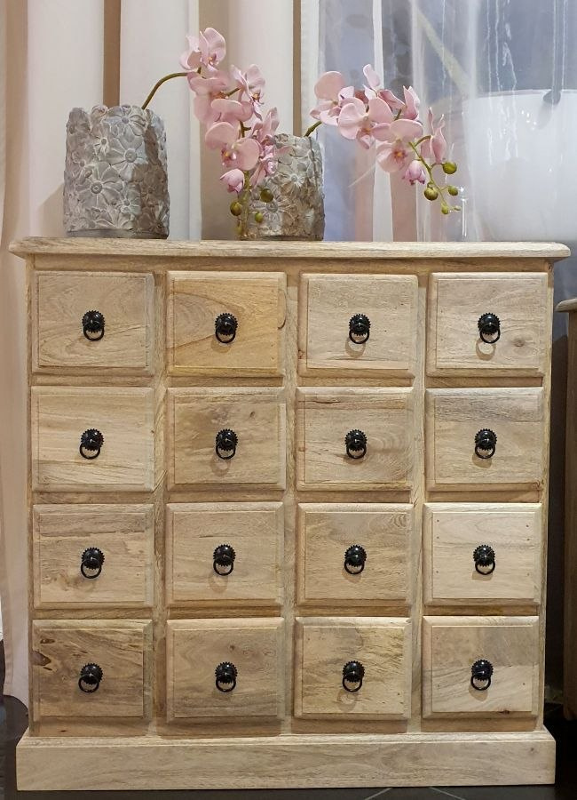 Ta wyjątkowa komoda została wykonana w małej, rodzinnej stolarni w Indiach. Komoda posiada aż szesnaście szufladek, do których przymocowano czarne, metalowe uchwyty rustykalne, ułatwiające otwieranie i są jednocześnie ozdobą. Komoda idealnie sprawdzi się jako mebel na drobiazgi i domowe skarby lub posłużyć może jako bieliźniarka dla osób, którą wyjątkową wagę przywiązują to segregacji i uporządkowania.