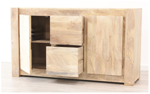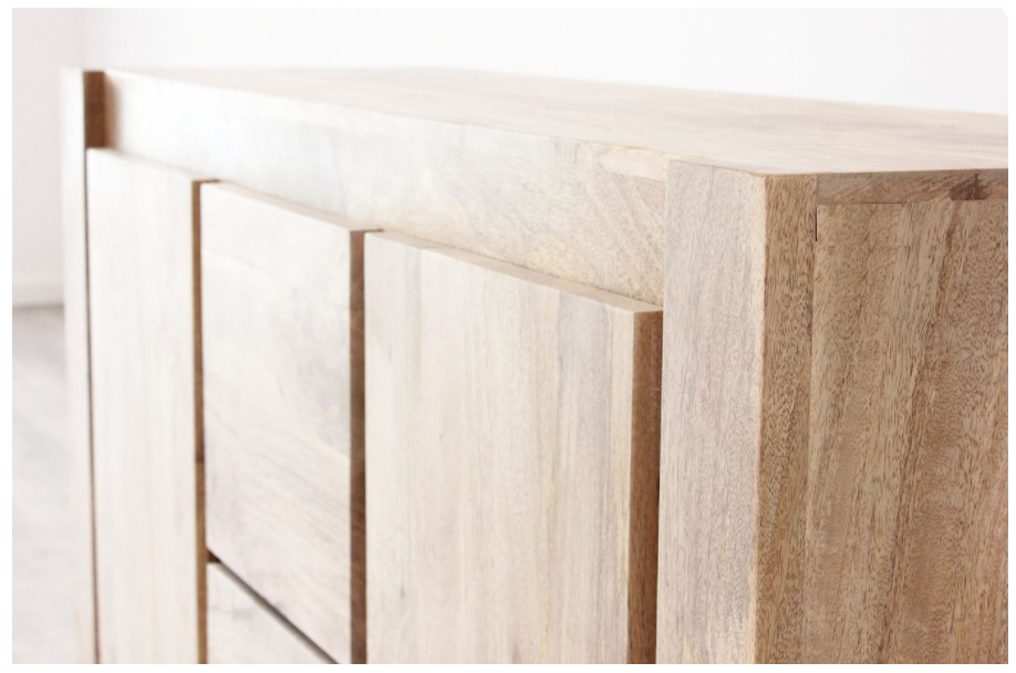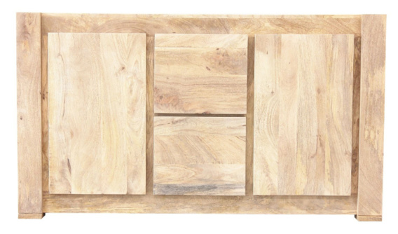 Komoda wykonana w Indiach z wysokiej jakości drewna mangowca w kolorze naturalnym, pokrytym matowym ekologicznym lakierem wodnym. Komoda posiada dwie pojemne szuflady na prowadnicach oraz dwie szafki z półkami. Wszystkie fronty posiadają wyżłobienia na bokach, które ułatwiają otwieranie.
