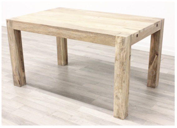 Mebel o neutralnym, ponadczasowym wyglądzie. Cechuje go prosta, stabilna i solidna konstrukcja. Stół wykonany z wyselekcjonowanego, egzotycznego drewna mangowca indyjskiego, w naturalnym odcieniu, którego piękno wydobyto dzięki zastosowaniu tradycyjnych indyjskich technik stolarskich. Blat stołu wykonany z długiej litej deski o grubości 3 cm. Stół pomalowany ekologicznym, akrylowym lakierem matowym.