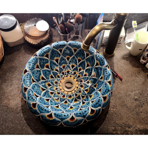 Okrągła niebieska umywalka ceramiczna z Meksyku.
