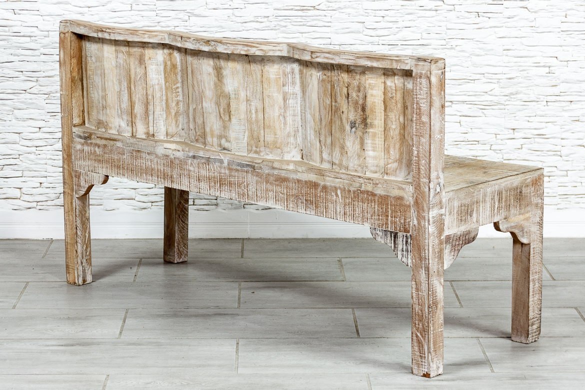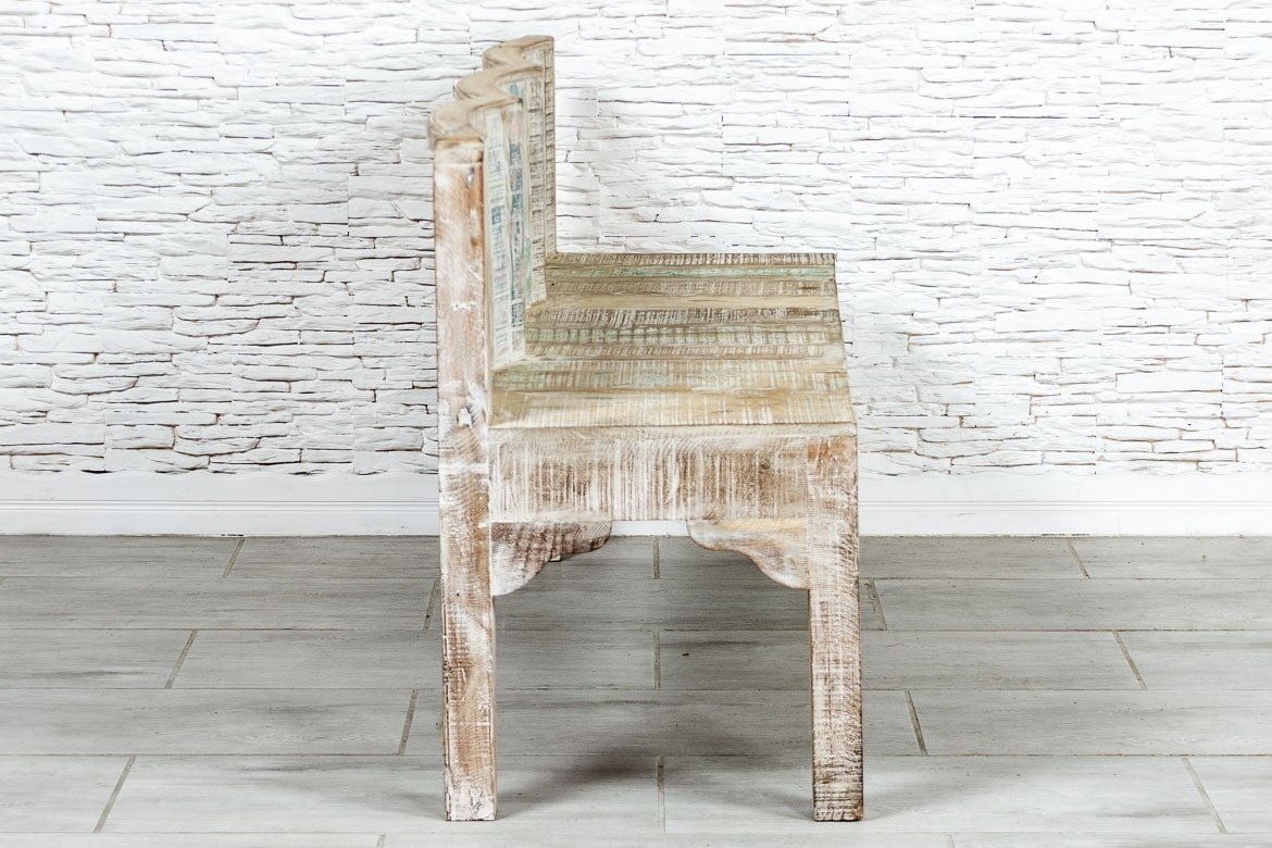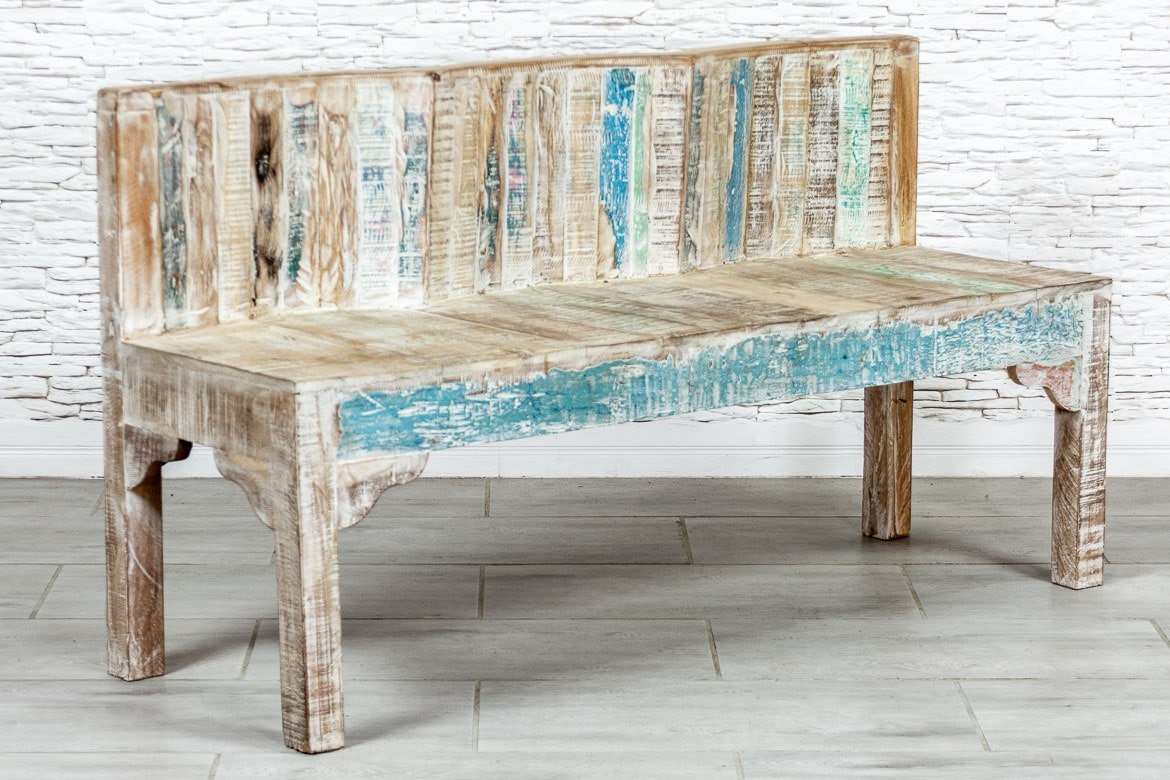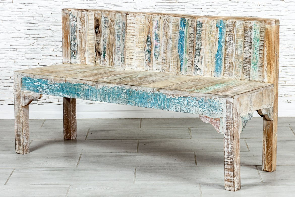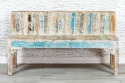 Trzyosobowa, przecierana ławka indyjska wykonana z drewna recyklingowego. Wybarwiona na odcienie bieli, niebieskości i zieleni w połączeniu z naturalnym kolorem drewna. Oparcie posiada trzy wgłębienia zwiększające komfort siedzenia. Mebel idealnie sprawdzi się w kuchni, jadalni lub na zadaszonym tarasie. Siedzisko znajduje się na wysokości 54cm.