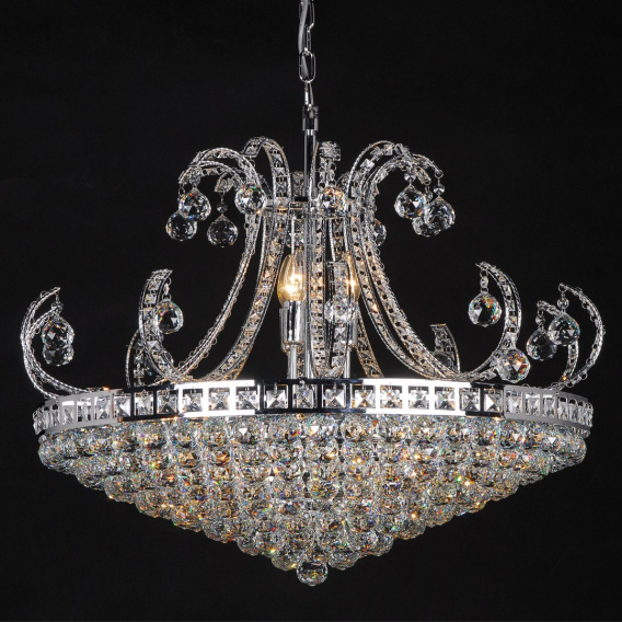 Ten duży żyrandol wykonano ze szkła i srebrnego metalu. Jest on niezwykle dekoracyjny i ciężko przejść obok niego obojętnie. Kuliste kryształy zamocowane na ozdobnej, metalowej obręczy przepięknie mienią się i połyskują w zależności od pory dnia i rodzaju światła. Strojne zwieńczenie dodaje mu jeszcze więcej wytworności. Taki żyrandol zaczaruje każdą przestrzeń.