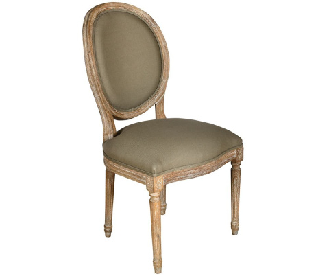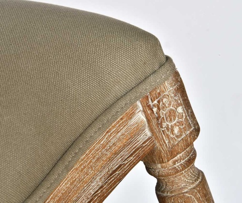 Stelaż wykonany z litego dębu bielonego i pokryty najwyżej klasy tapicerką w odcieniu oliwkowym. Przepiękny, klasyczny kształt inspirowany meblami z dawnych lat i stylem dworkowym, oddaje hołd ponadczasowej elegancji muśniętej współczesnością. Wygodne, miękkie siedzisko i wyprofilowane oparcie sprawiają, że krzesło jest bardzo wygodne. Szczotkowane, celowo postarzone drewno i rustykalne przetarcia zmiękczają archaiczny charakter mebla.